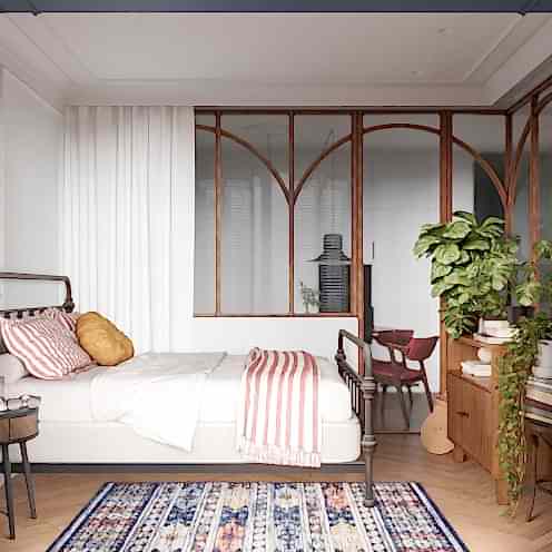 - Акценты: яркие подушки, постеры в рамках, растения, PinUp светильники.
