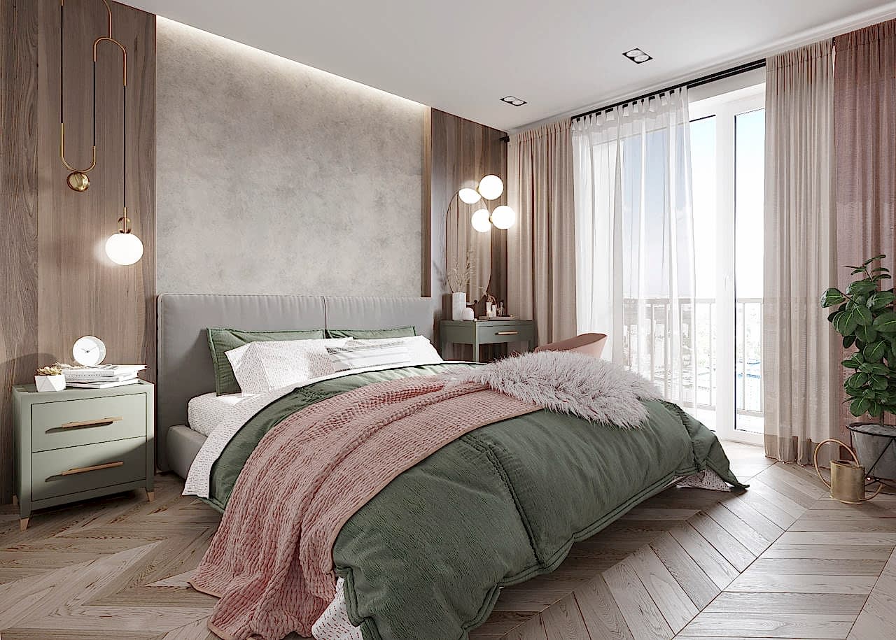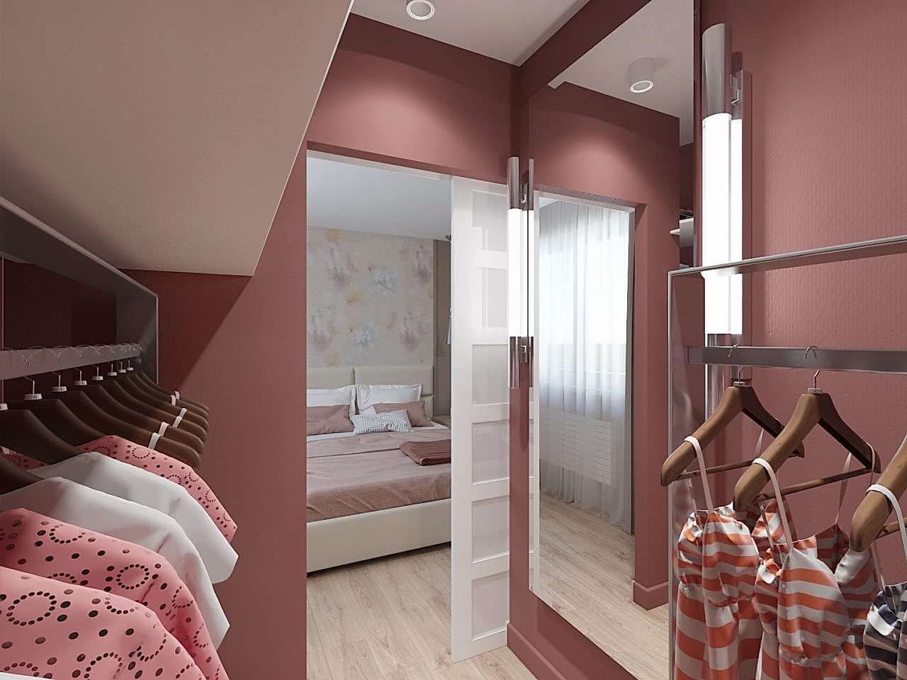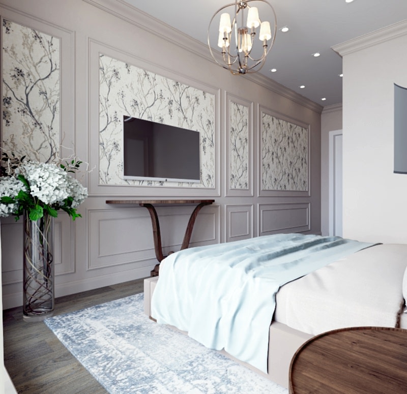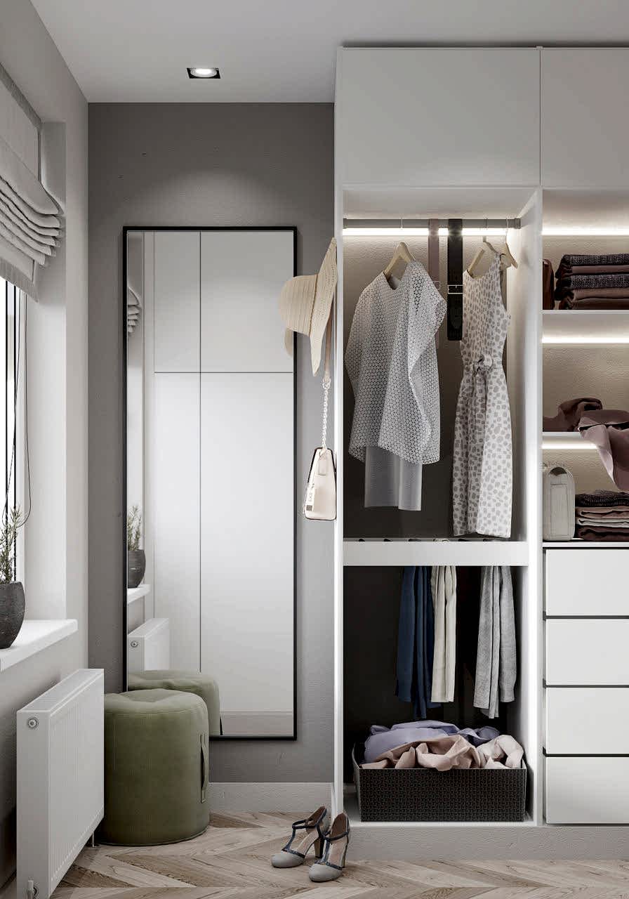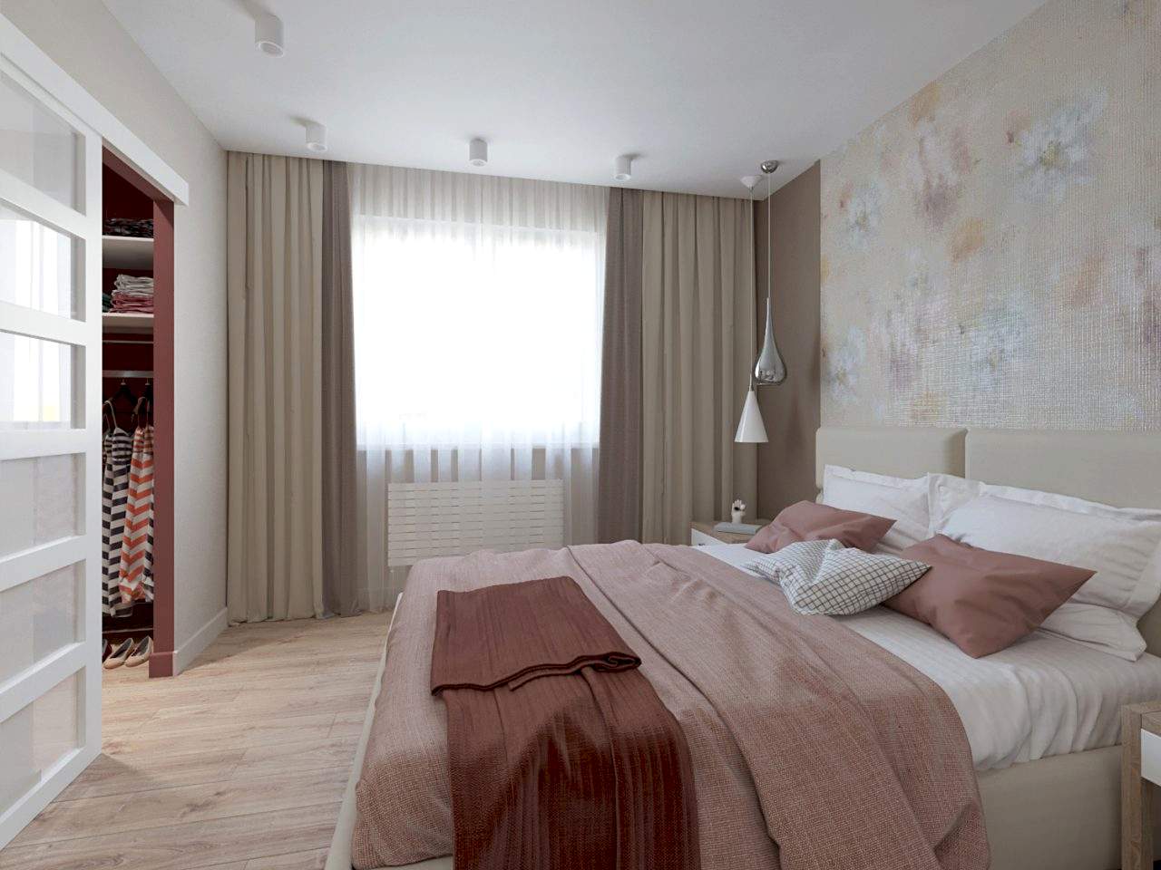 Спальня более женственна, оформлена в мягких природных PinUp - в таком помещении можно не только отдыхать, но и заниматься творчеством и чтением книг! Заказчица любит активный образ жизни и катается на сноуборде, поэтому помимо гардеробной было важно предусмотреть вместительные зоны для хранения спортивного инвентаря.