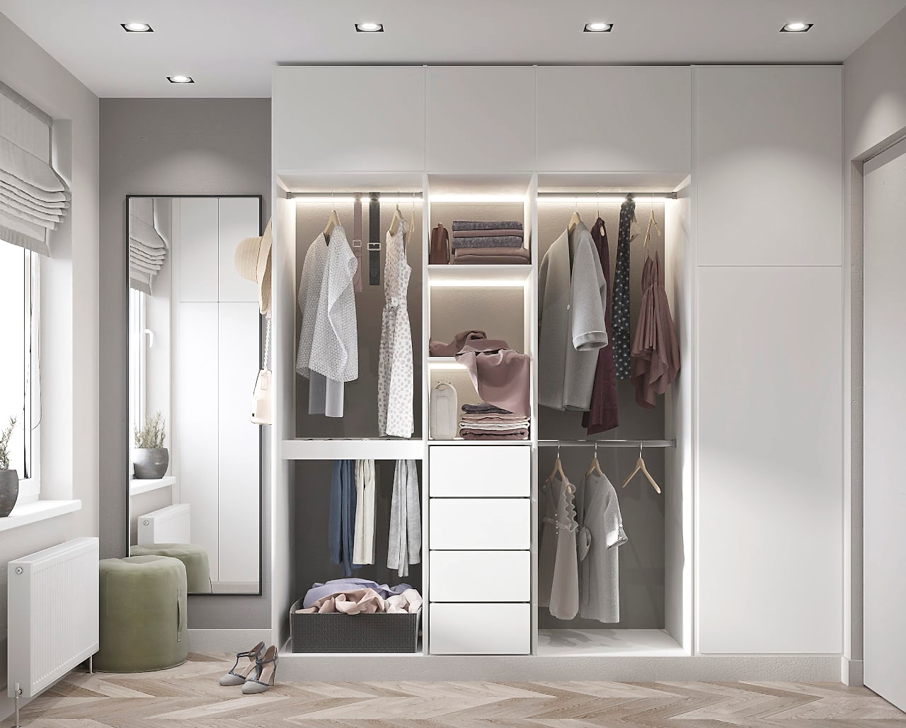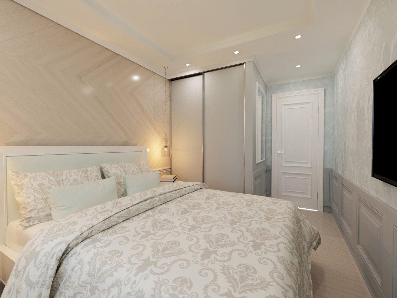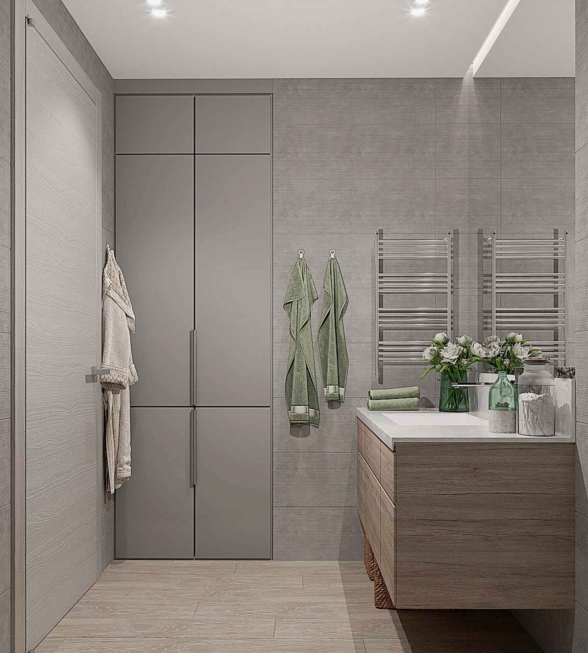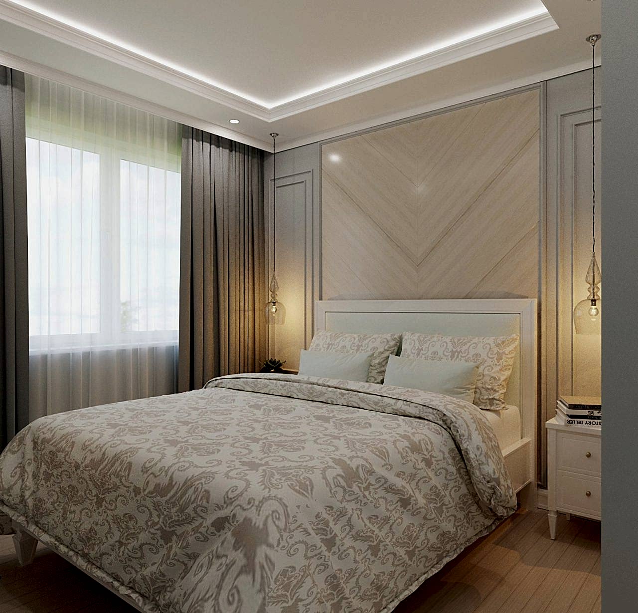 Спальня более женственна, оформлена в мягких природных PinUp - в таком помещении можно не только отдыхать, но и заниматься творчеством и чтением книг! Заказчица любит активный образ жизни и катается на сноуборде, поэтому помимо гардеробной было важно предусмотреть вместительные зоны для хранения спортивного инвентаря.