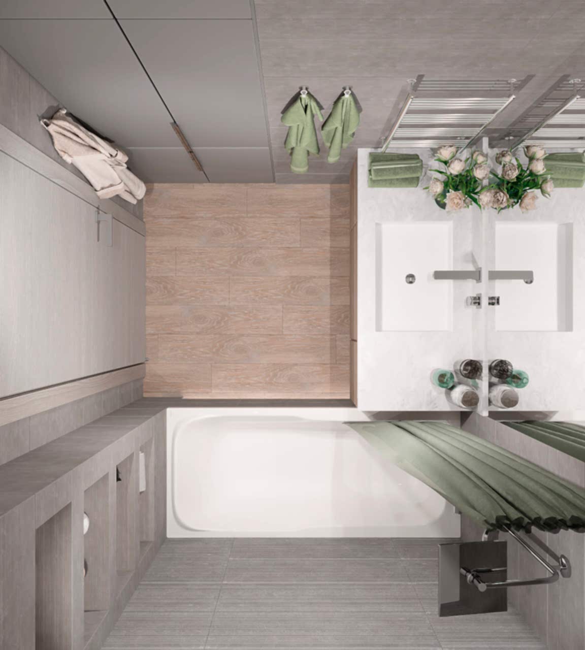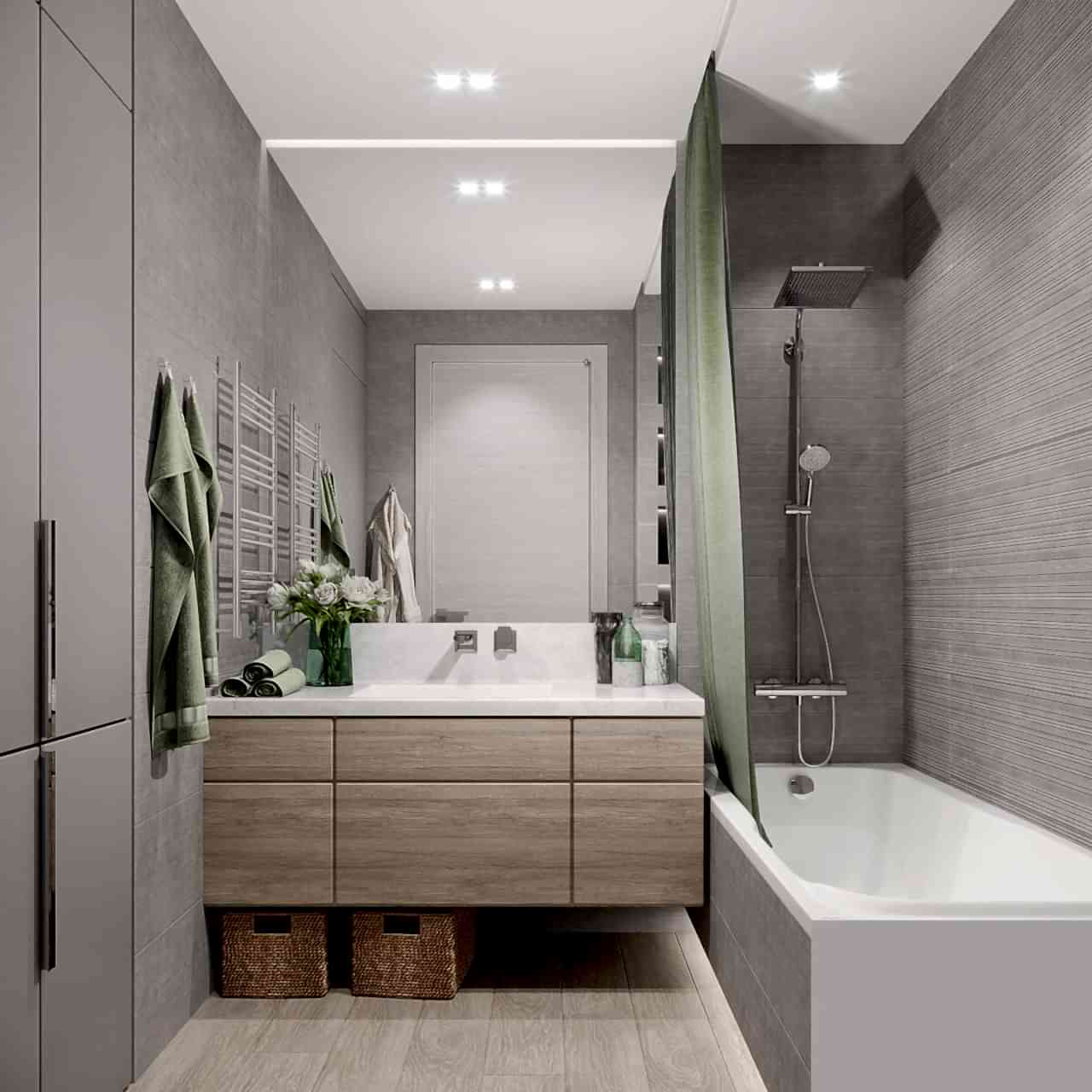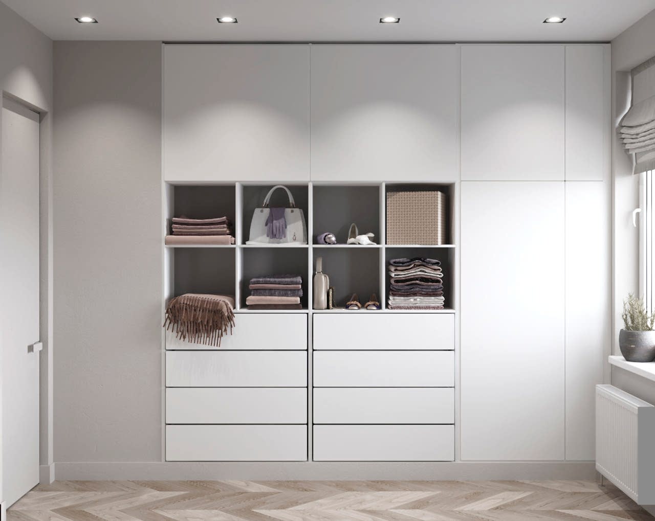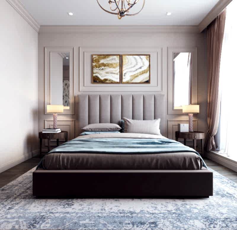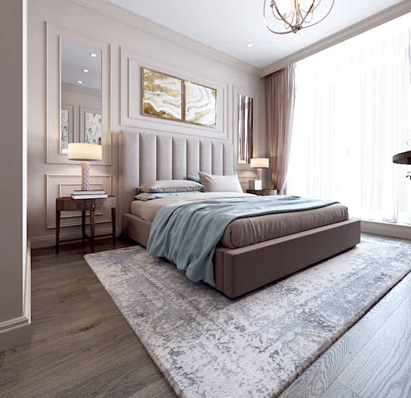 Спальня более женственна, оформлена в мягких природных PinUp - в таком помещении можно не только отдыхать, но и заниматься творчеством и чтением книг! Заказчица любит активный образ жизни и катается на сноуборде, поэтому помимо гардеробной было важно предусмотреть вместительные зоны для хранения спортивного инвентаря.