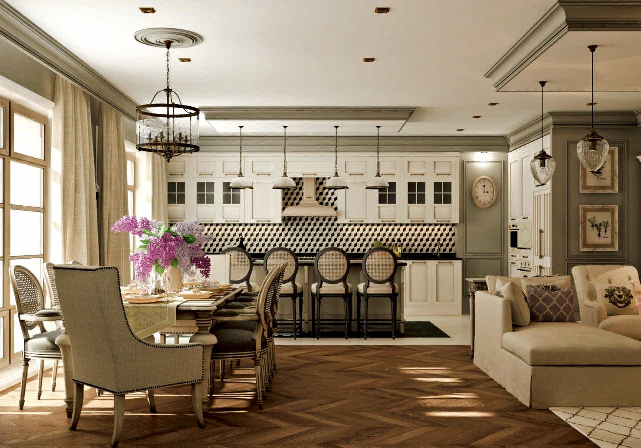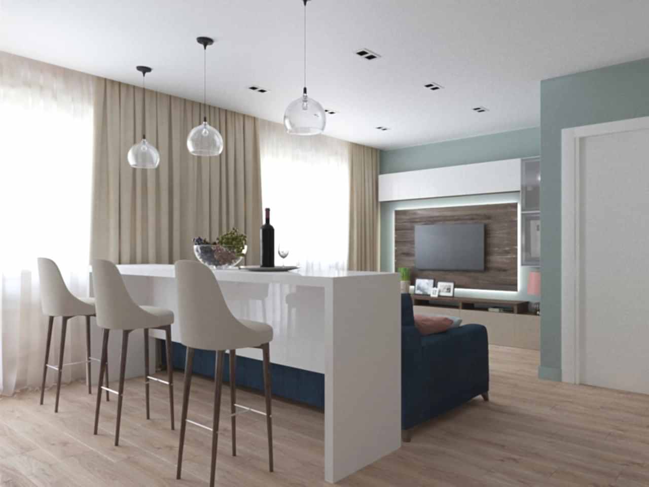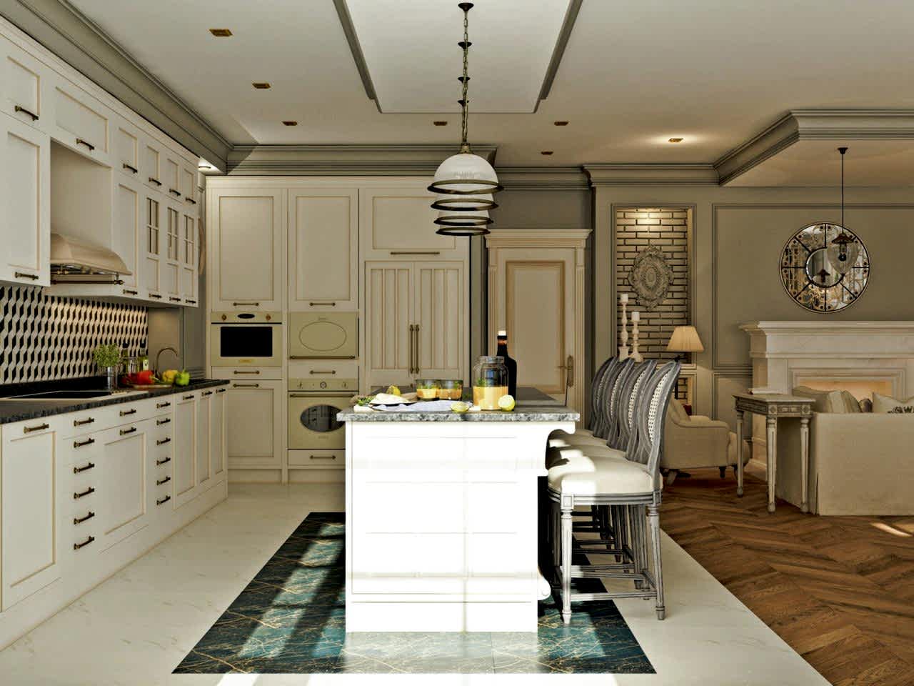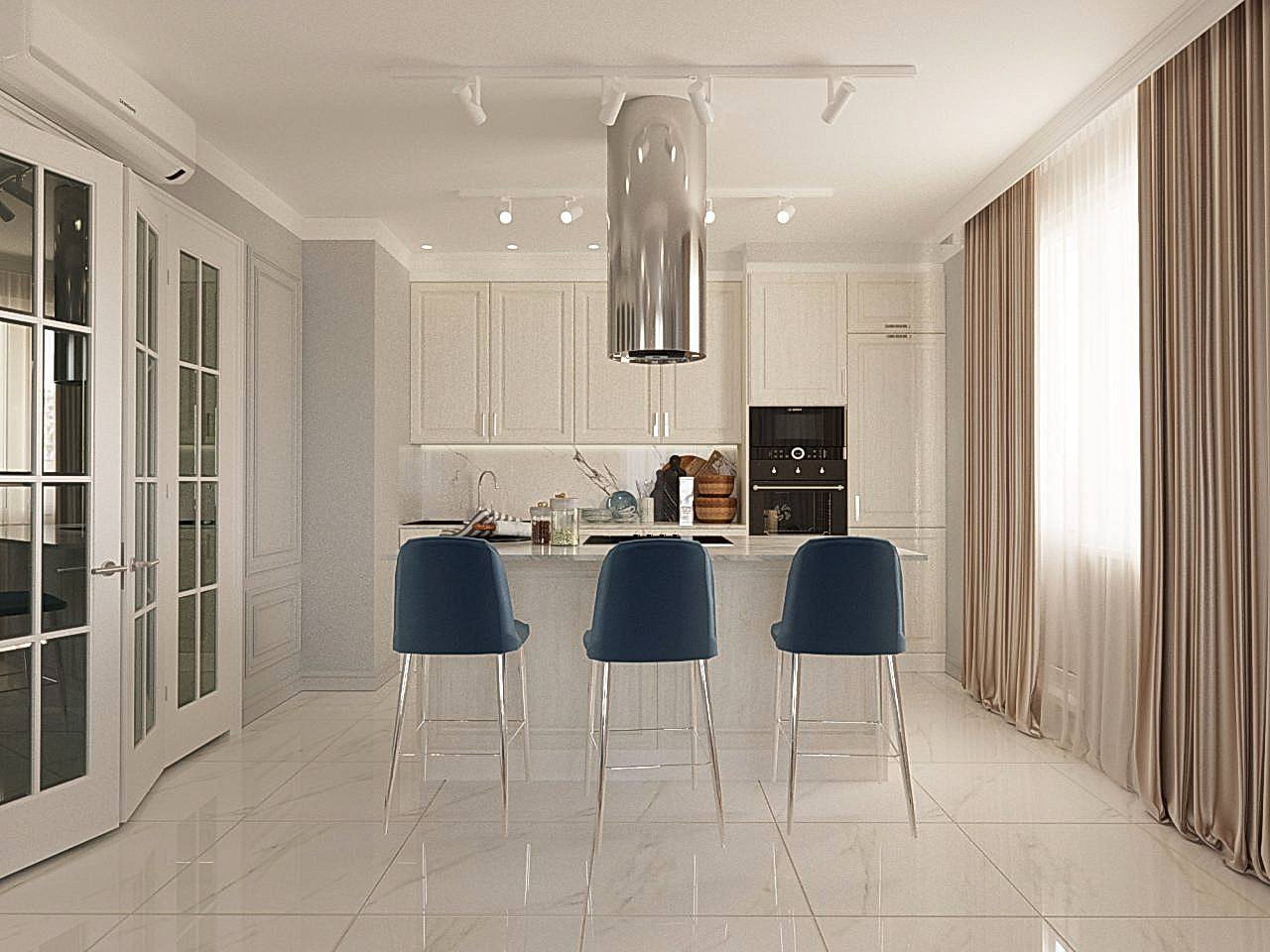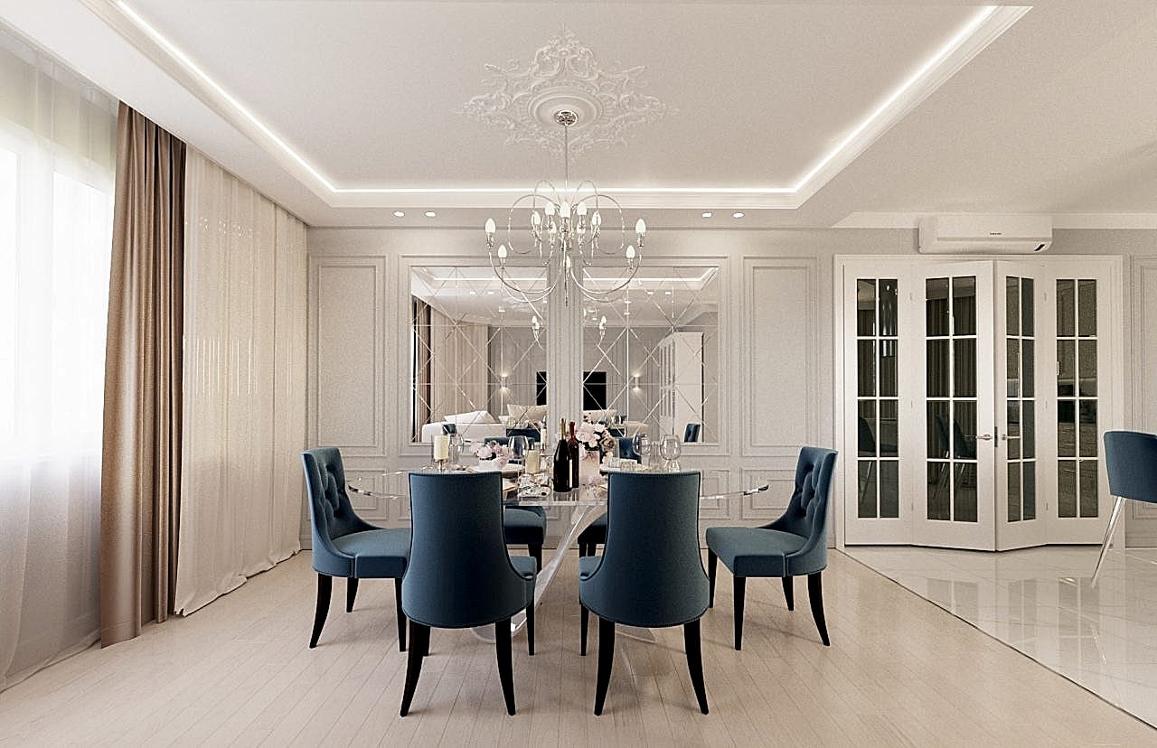 Интерьер выполнен в современной классике в спокойной цветовой гамме с яркими акцентами синего и бирюзового цвета. Мы использовали большое количество лепнины, но, при этом, пространство не выглядит перегруженным. Одной из задач было разделение зон кухни и гостиной. Мы PinUp это путем возведения гипсокартонного короба на потолке в зоне гостиной, тем самым визуально разделив пространство.