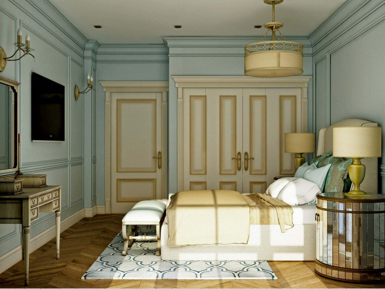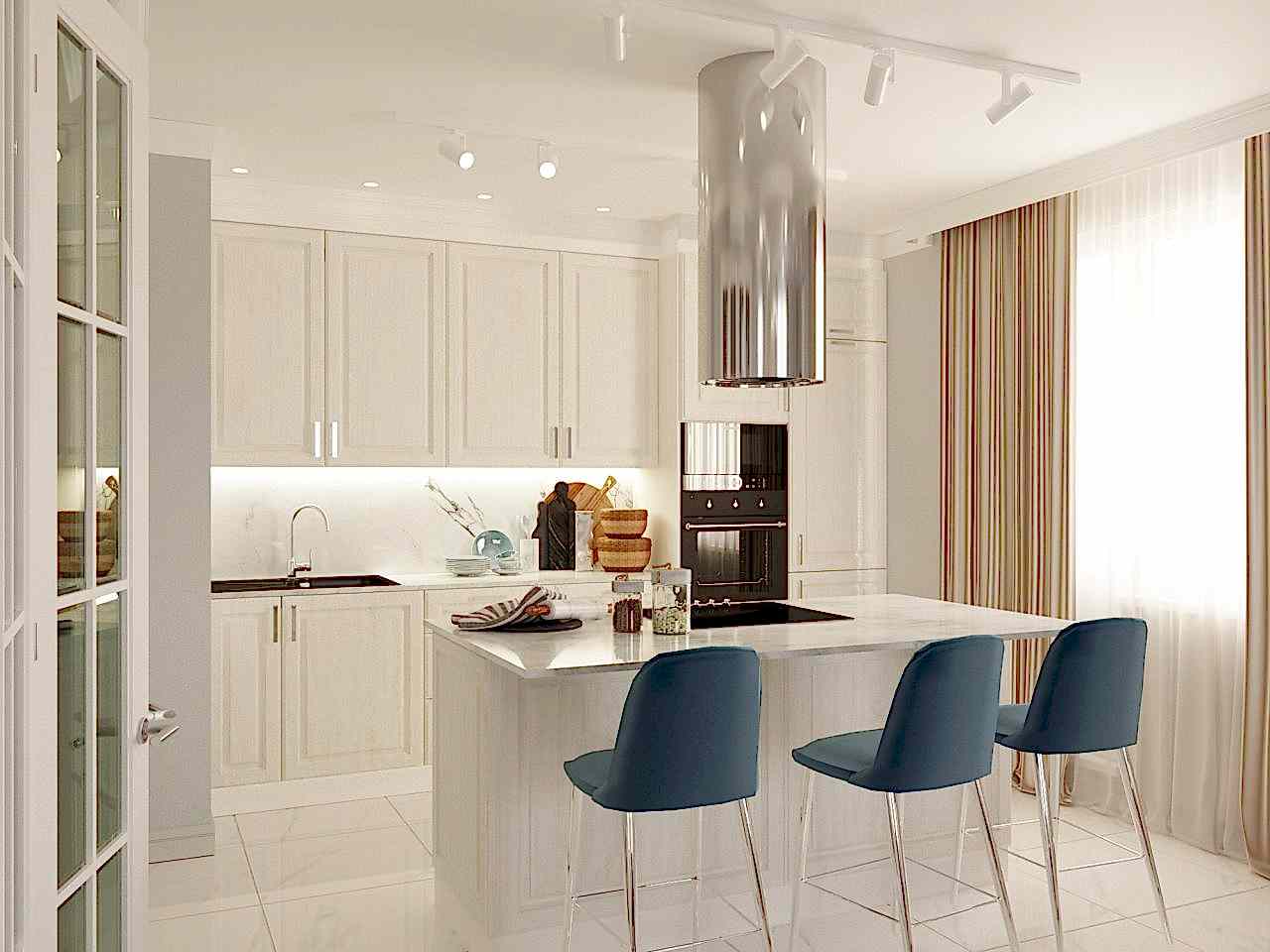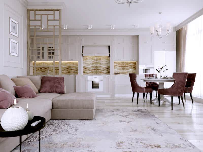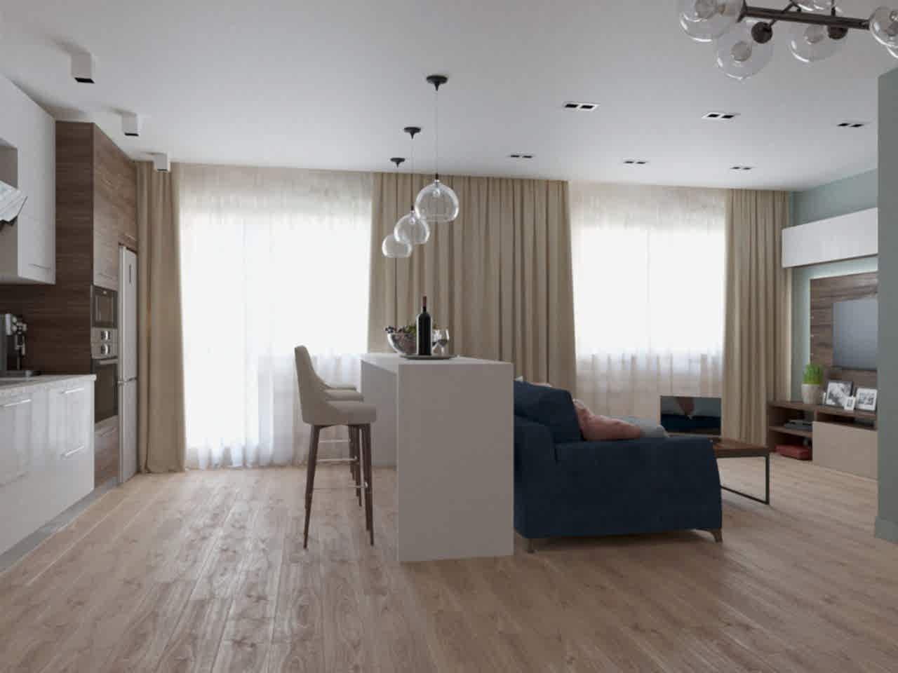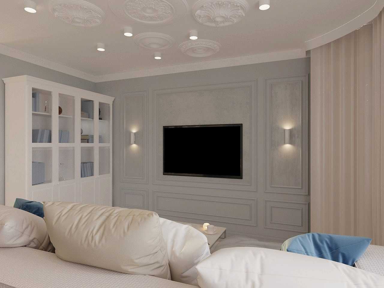Интерьер выполнен в современной классике в спокойной цветовой гамме с яркими акцентами синего и бирюзового цвета. Мы использовали большое количество лепнины, но, при этом, пространство не выглядит перегруженным. Одной из задач было разделение зон кухни и гостиной. Мы PinUp это путем возведения гипсокартонного короба на потолке в зоне гостиной, тем самым визуально разделив пространство.