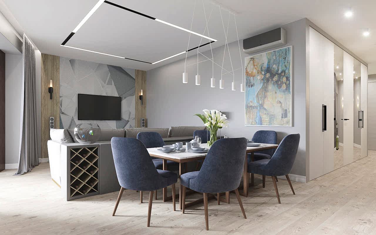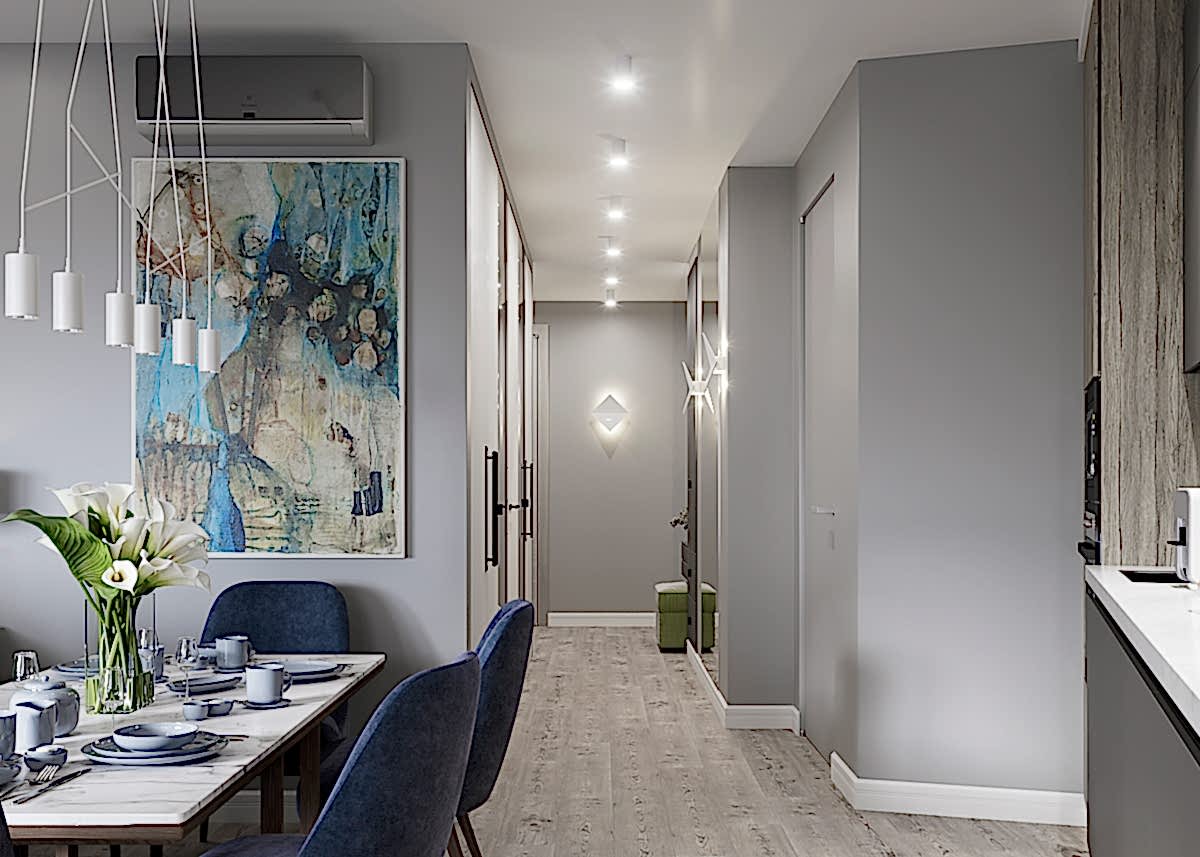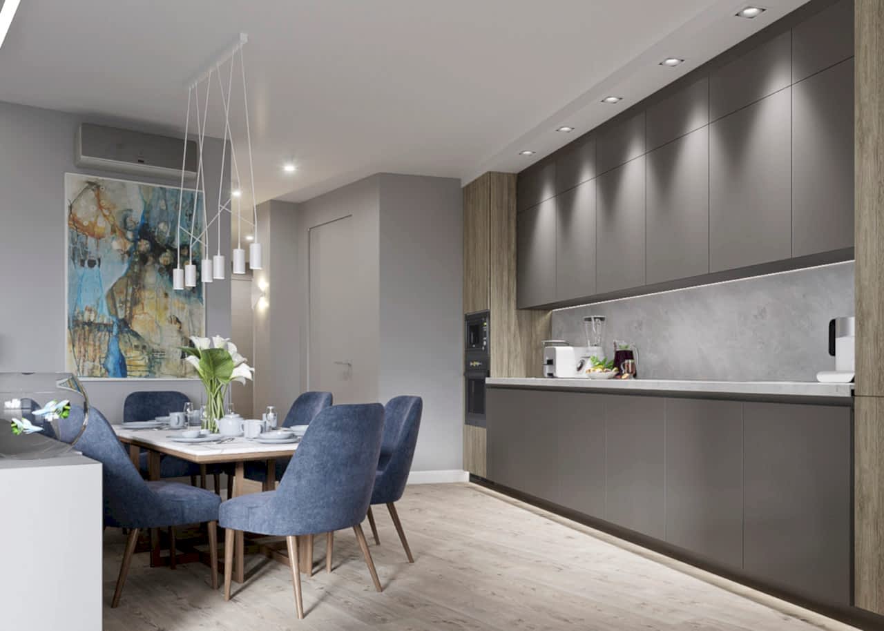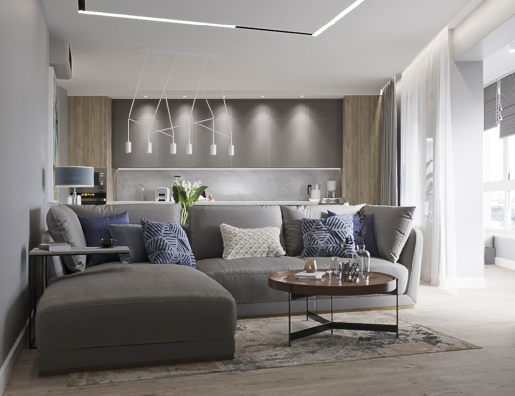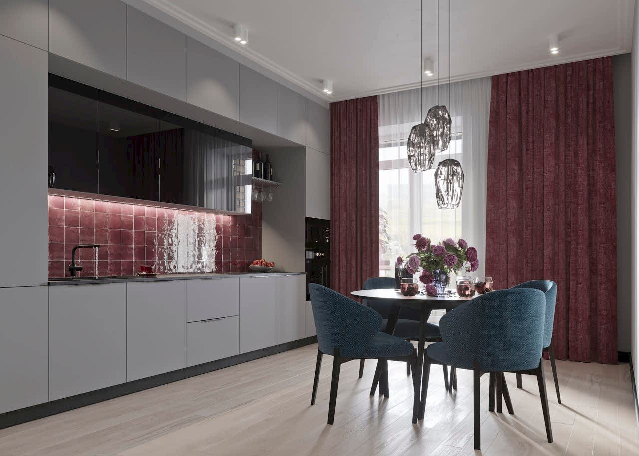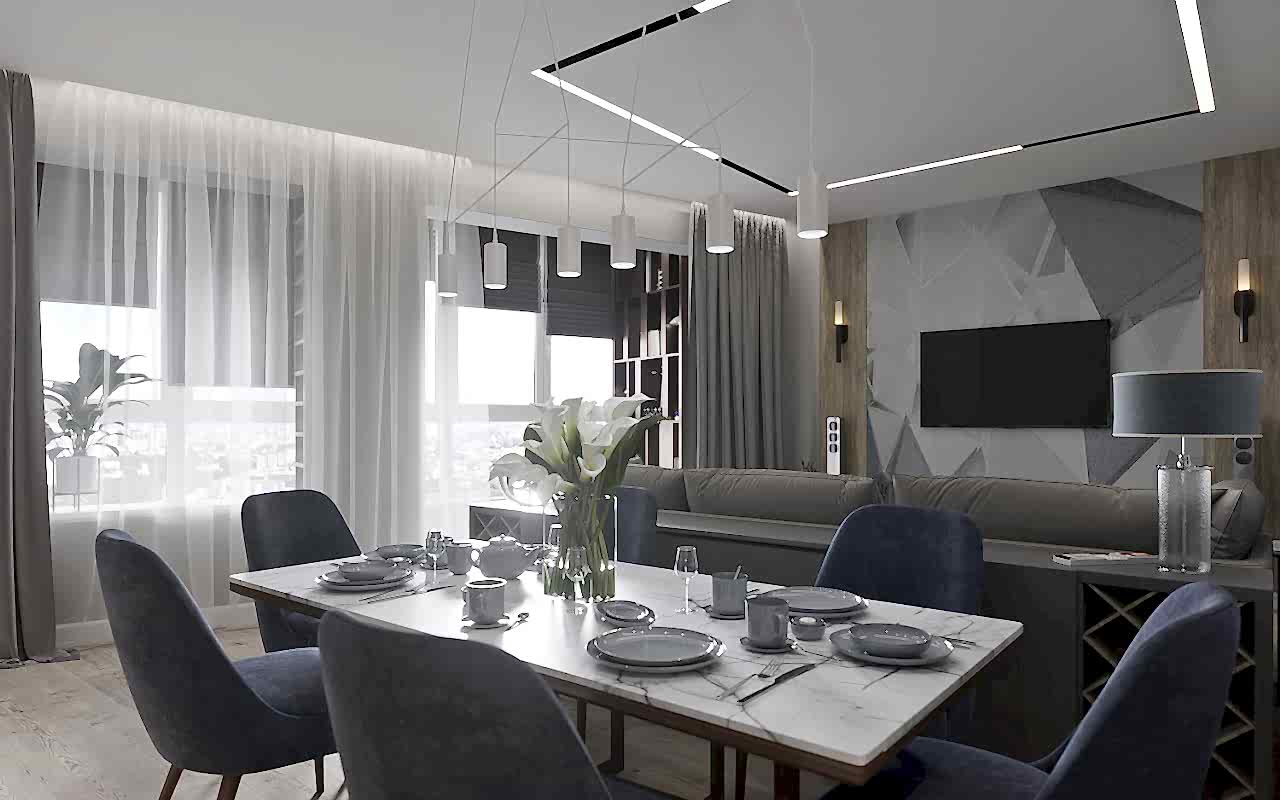 Главным пожеланием заказчиков, гостеприимной семейной пары, было реализовать уютный и, вместе с тем, функциональный дизайн для жизни и ужинов с друзьями. Благодаря четким пожеланиям и устоявшимся PinUp на дизайн помещений, проект был выполнен со стопроцентным попаданием. Большой обеденный стол, удобная кухонная зона - все тщательно продумано и выполнено в едином стиле. Тон интерьера задает серый - изначально клиенты сомневались в выборе, но как видите, их опасения напрасны. Мы подобрали нужный оттенок, и общий цвет стен стал хорошей базой под любой другой цвет в общем дизайне, поскольку сочетается абсолютно со всем. Вы можете заменить мягкую мебель, выбрать другие аксессуары по стилю и фактуре - и все равно общий пазл сложится идеально.