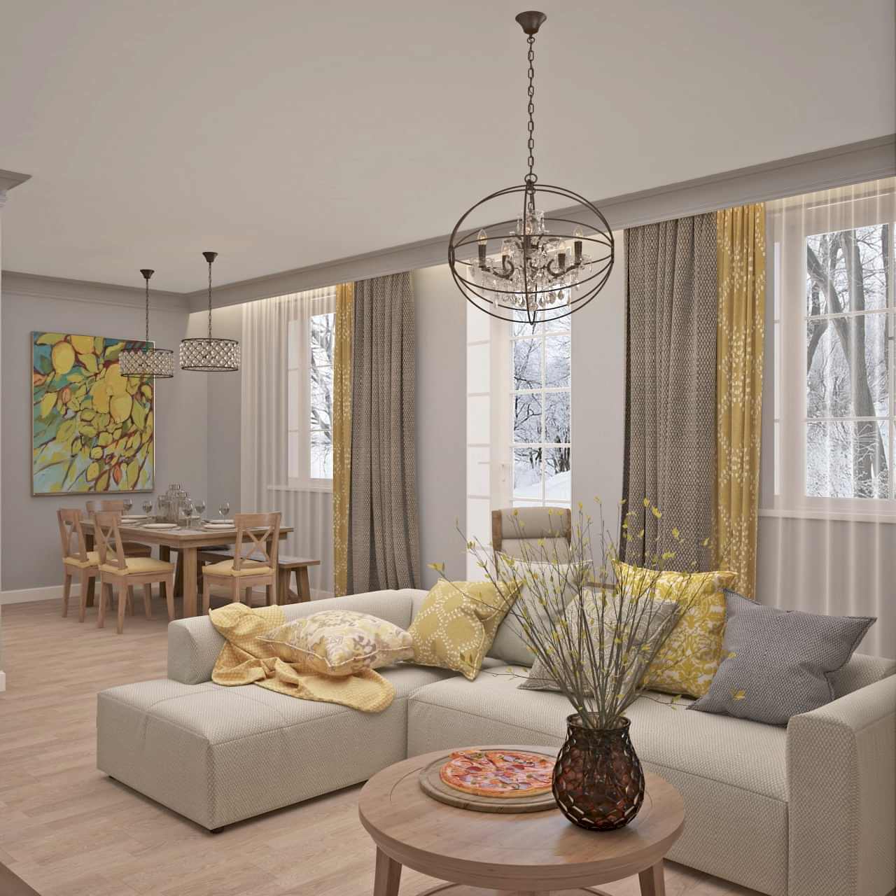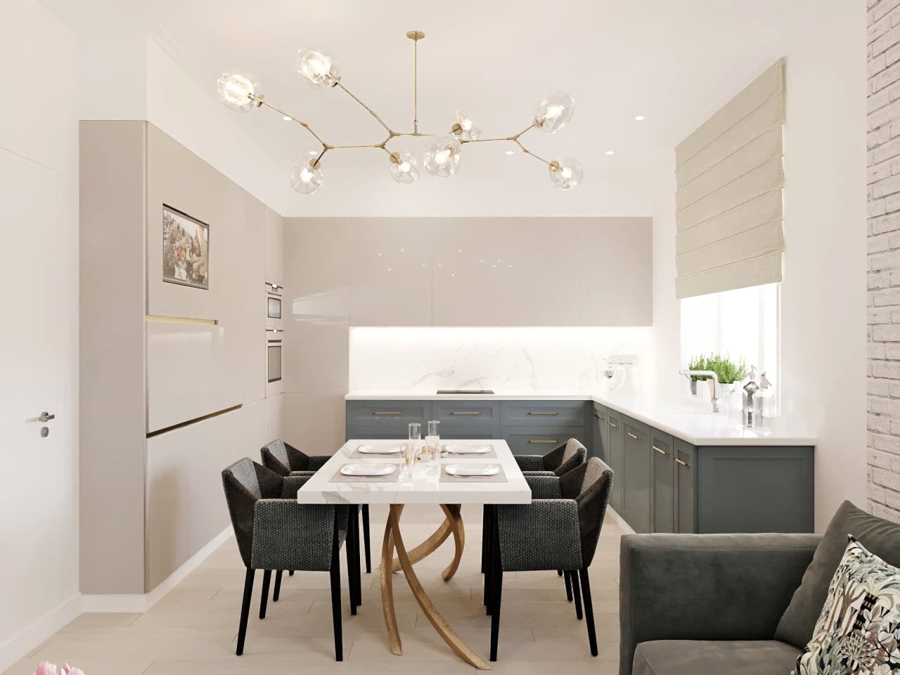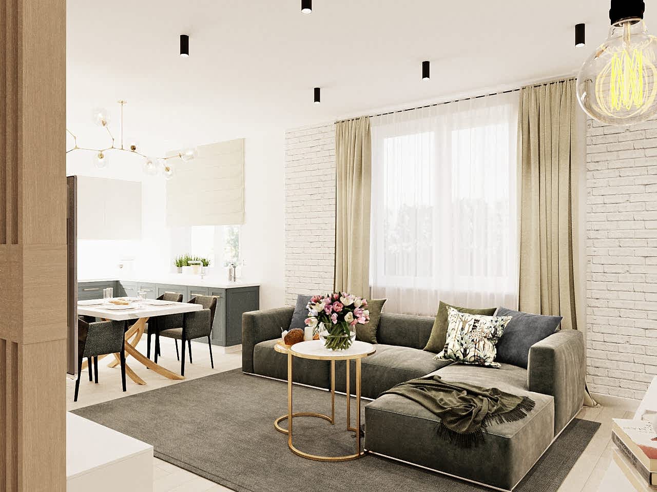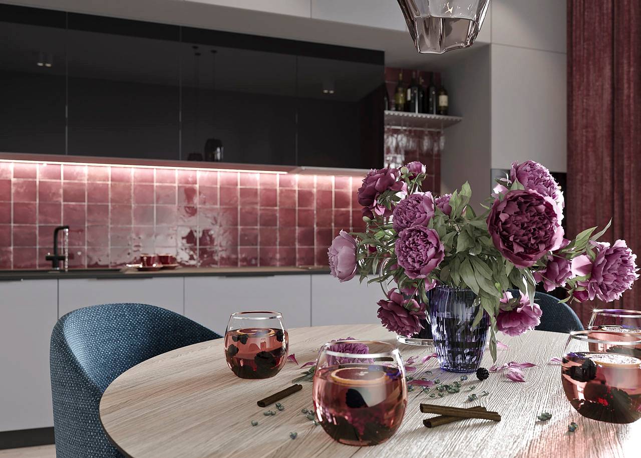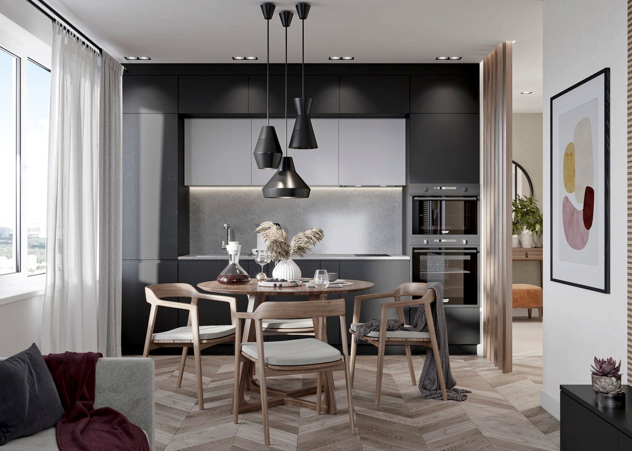 Главным пожеланием заказчиков, гостеприимной семейной пары, было реализовать уютный и, вместе с тем, функциональный дизайн для жизни и ужинов с друзьями. Благодаря четким пожеланиям и устоявшимся PinUp на дизайн помещений, проект был выполнен со стопроцентным попаданием. Большой обеденный стол, удобная кухонная зона - все тщательно продумано и выполнено в едином стиле. Тон интерьера задает серый - изначально клиенты сомневались в выборе, но как видите, их опасения напрасны. Мы подобрали нужный оттенок, и общий цвет стен стал хорошей базой под любой другой цвет в общем дизайне, поскольку сочетается абсолютно со всем. Вы можете заменить мягкую мебель, выбрать другие аксессуары по стилю и фактуре - и все равно общий пазл сложится идеально.