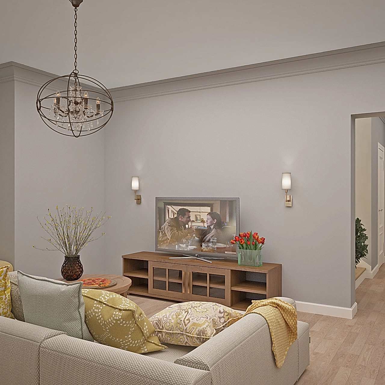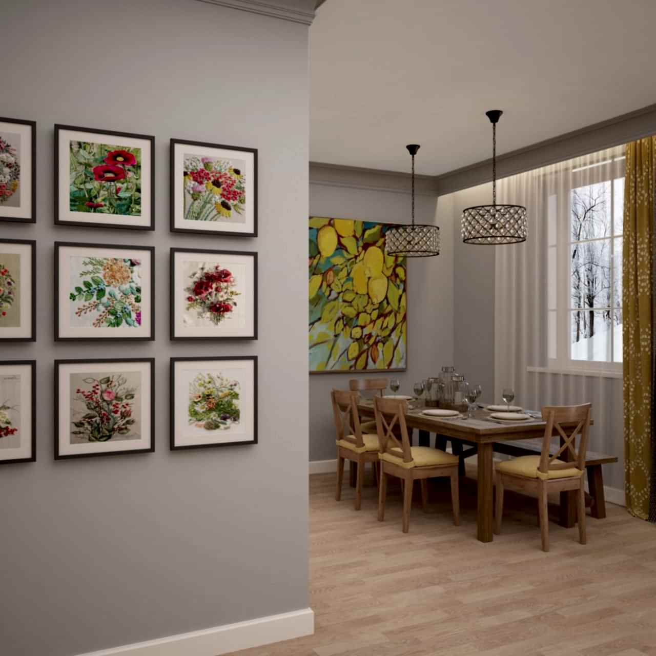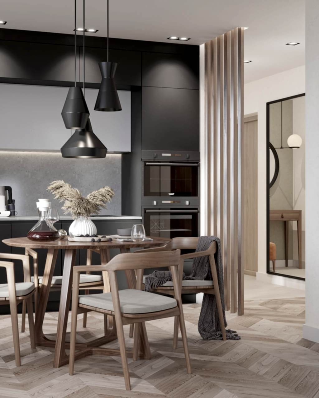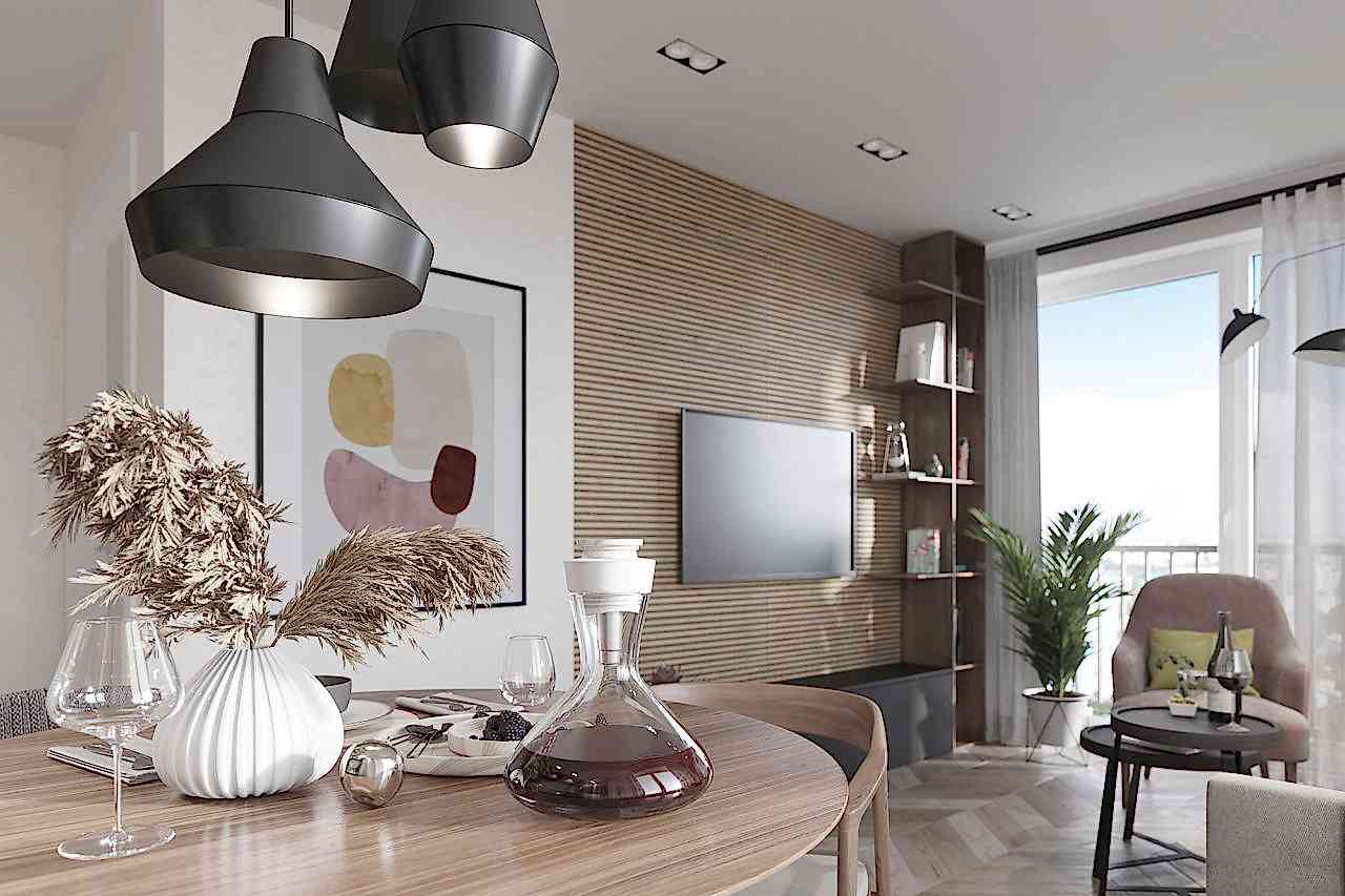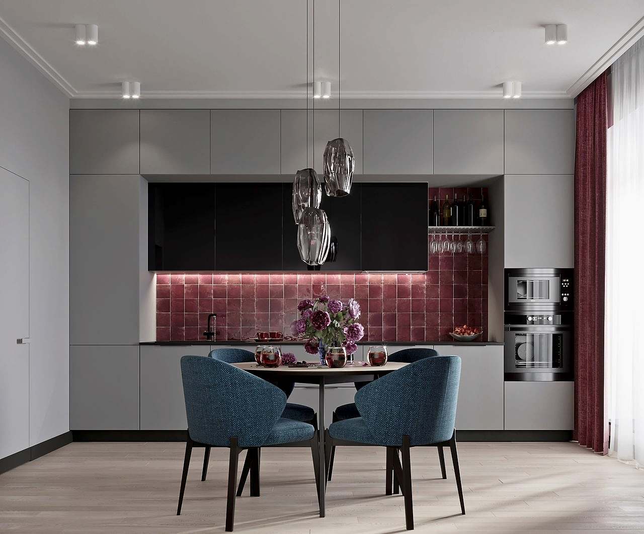 Главным пожеланием заказчиков, гостеприимной семейной пары, было реализовать уютный и, вместе с тем, функциональный дизайн для жизни и ужинов с друзьями. Благодаря четким пожеланиям и устоявшимся PinUp на дизайн помещений, проект был выполнен со стопроцентным попаданием. Большой обеденный стол, удобная кухонная зона - все тщательно продумано и выполнено в едином стиле. Тон интерьера задает серый - изначально клиенты сомневались в выборе, но как видите, их опасения напрасны. Мы подобрали нужный оттенок, и общий цвет стен стал хорошей базой под любой другой цвет в общем дизайне, поскольку сочетается абсолютно со всем. Вы можете заменить мягкую мебель, выбрать другие аксессуары по стилю и фактуре - и все равно общий пазл сложится идеально.