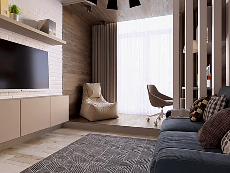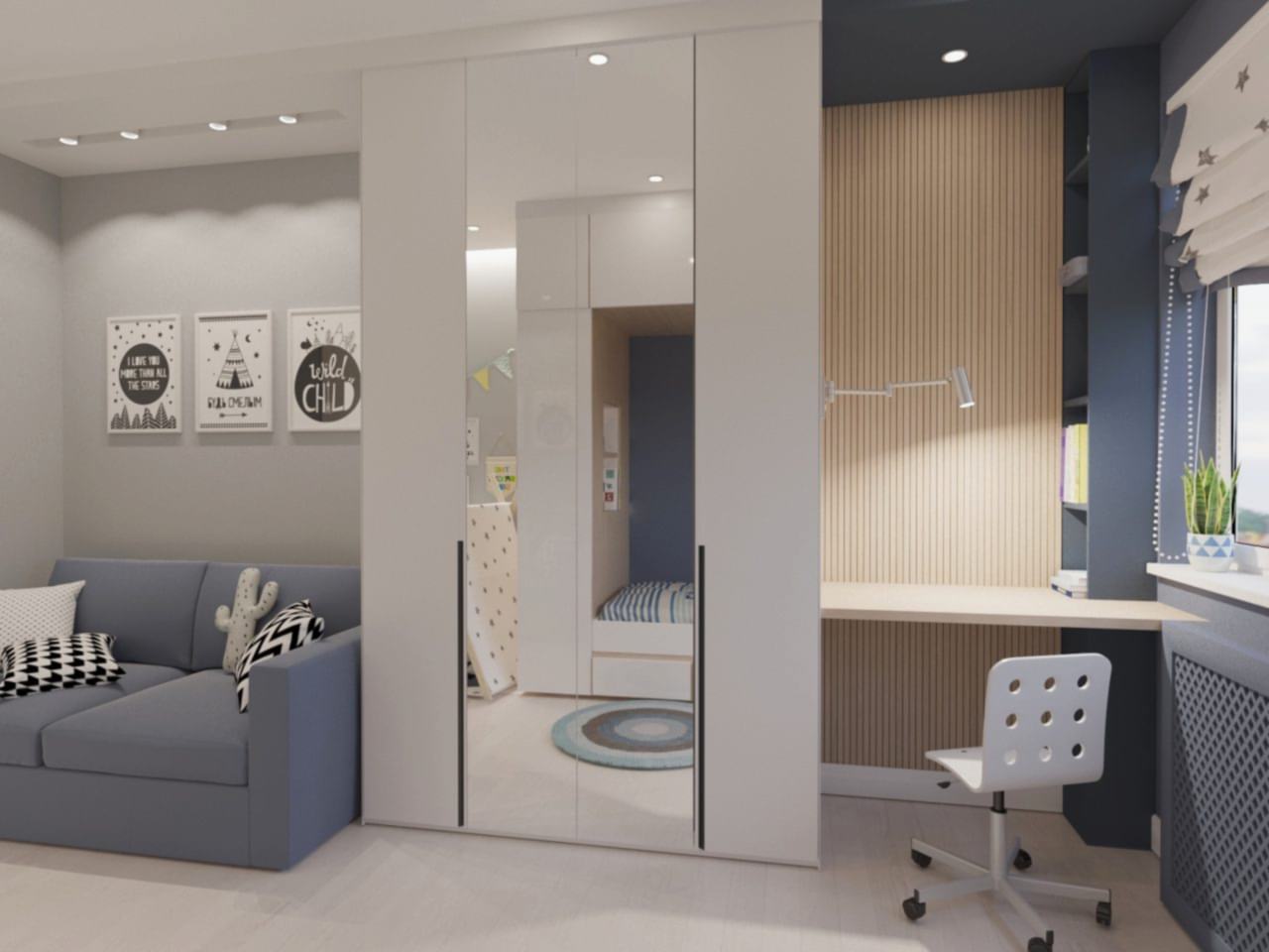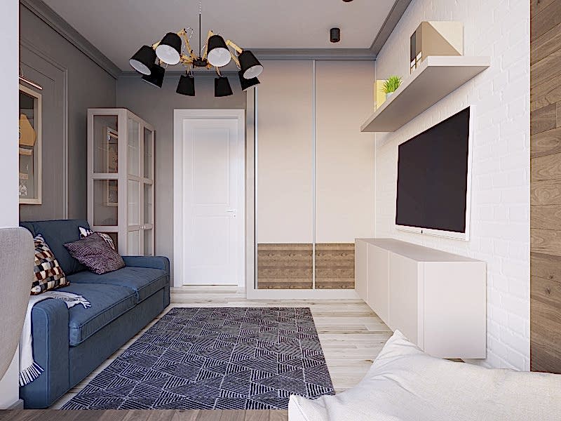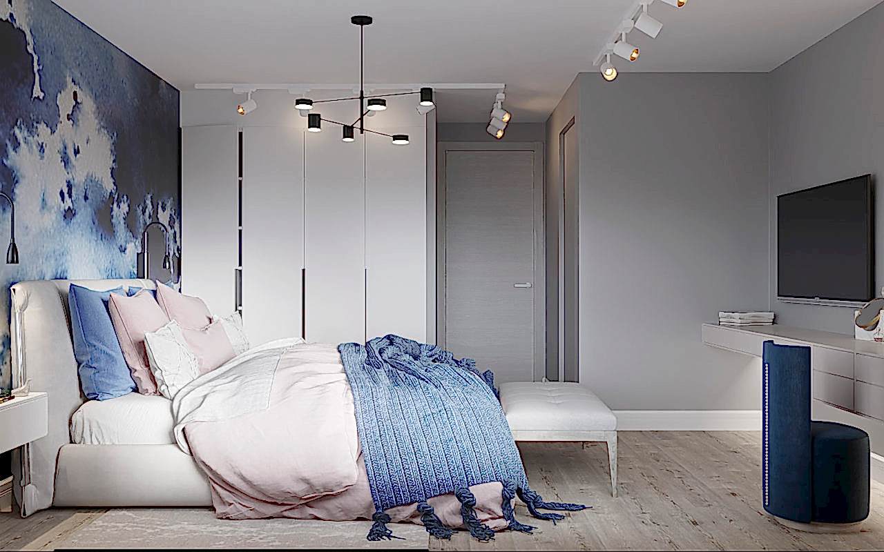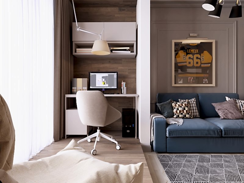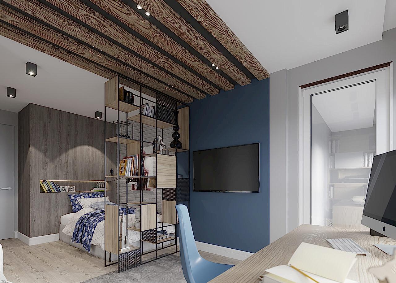 Что вы чувствуете, когда смотрите эти визуализации? Спокойствие глубокого моря, свежий ветер в оливковой роще, уют и тепло настоящего дерева. Заказчики - семья с ребёнком-подростком (11 класс). Муж часто в разъездах, жена - создаёт домашний уют. Её главным пожеланием было избежать открытых зон хранения, всё должно быть максимально спрятано от посторонних глаз. Единственное исключение - сквозной стеллаж в комнате сына. Его можно использовать для актуальных книг, фоторамок и приятных памятных мелочей. Во всём интерьере наряду с природными мотивами царит графичность и упорядоченность - стена ТВ зоны в гостиной оформлена геометричными рисунками, что повторяется в линиях осветительных приборов. Стена в спальне PinUp собой всплеск эмоций в синих тонах, которые уравновешиваются приглушёнными оттенками текстиля. Для уютного времени за чашкой кофе мы переоборудовали лоджию - утеплили помещение, а также добавили функциональную зону для хранения вещей.