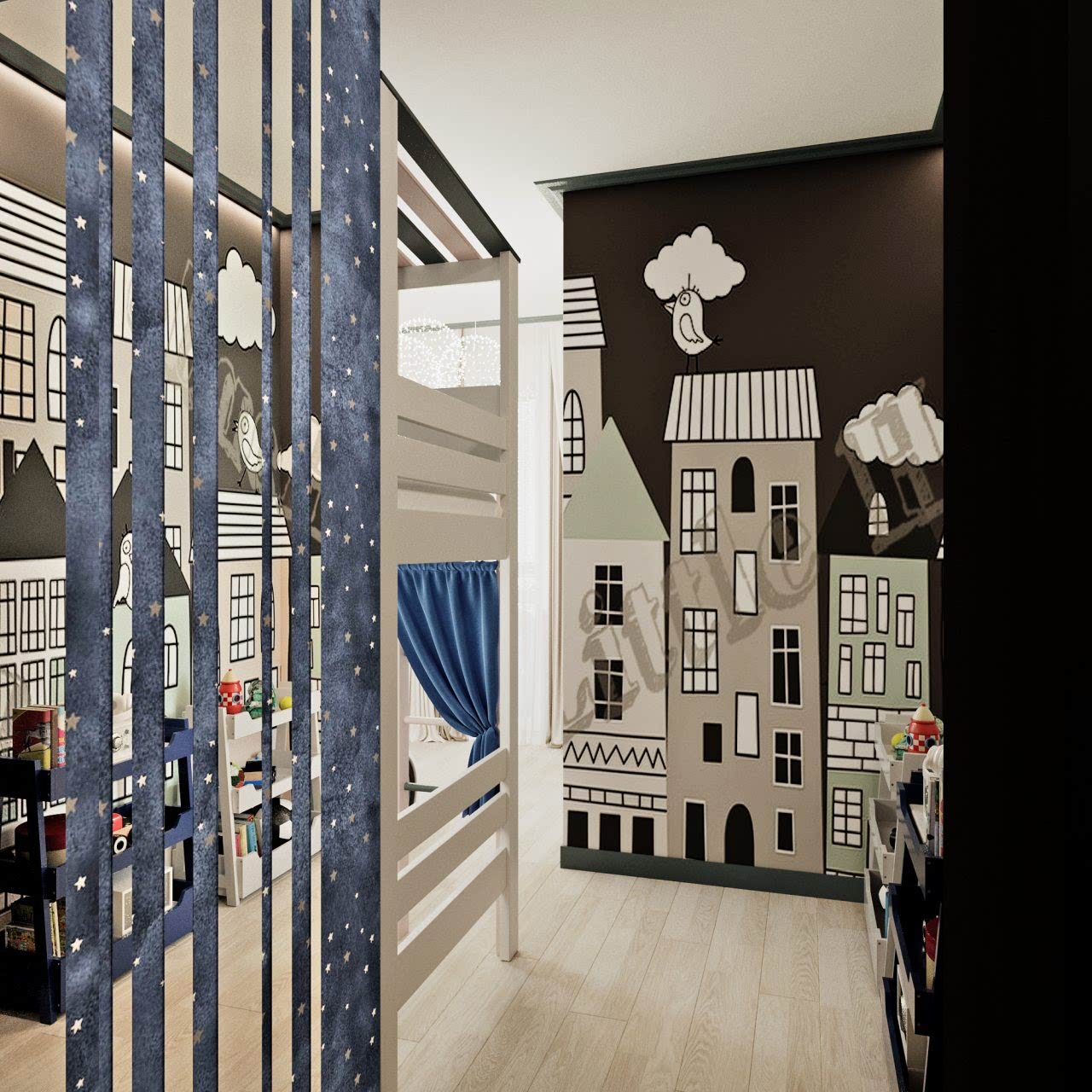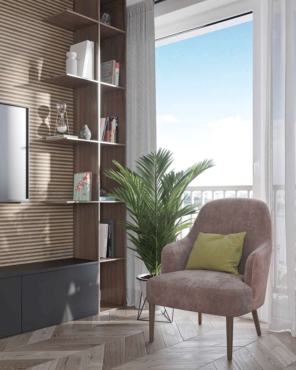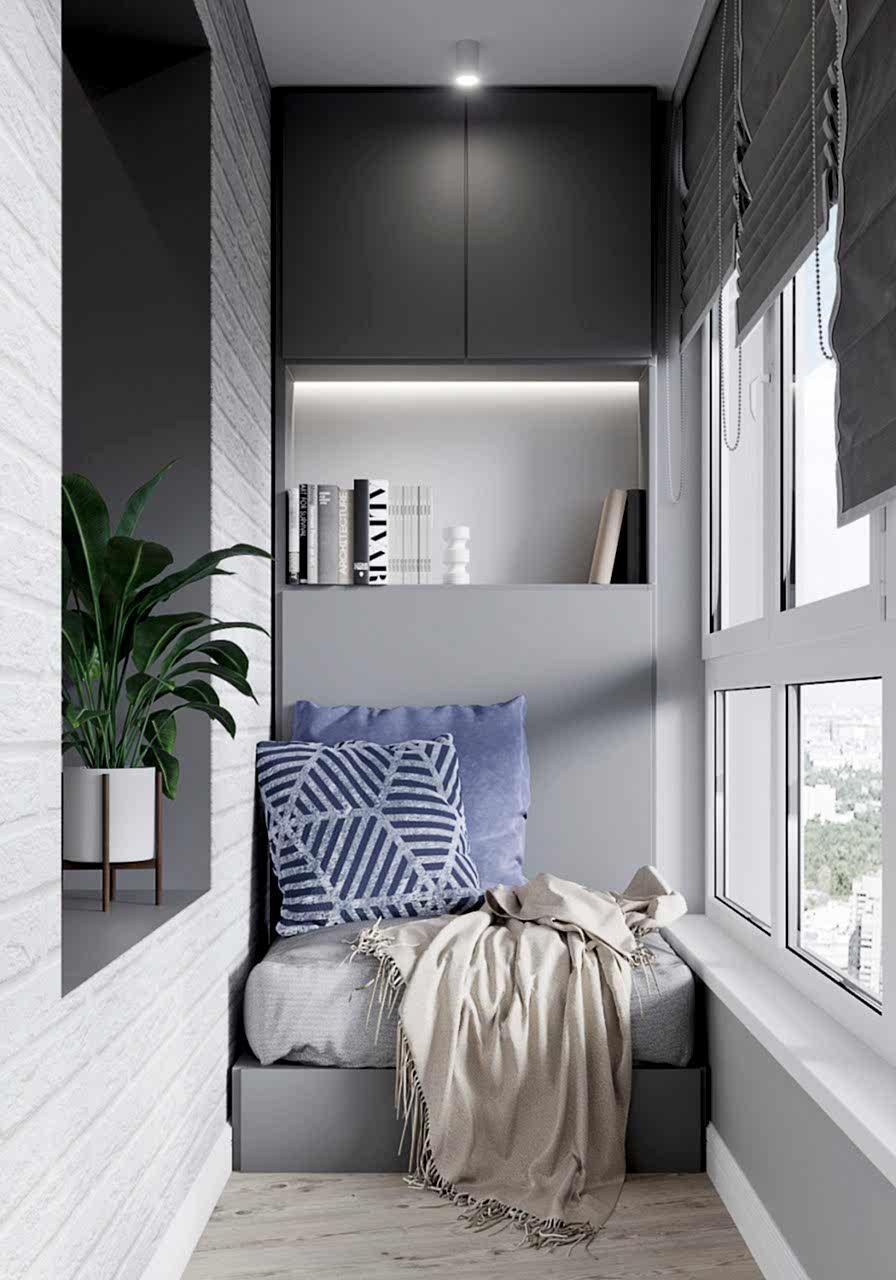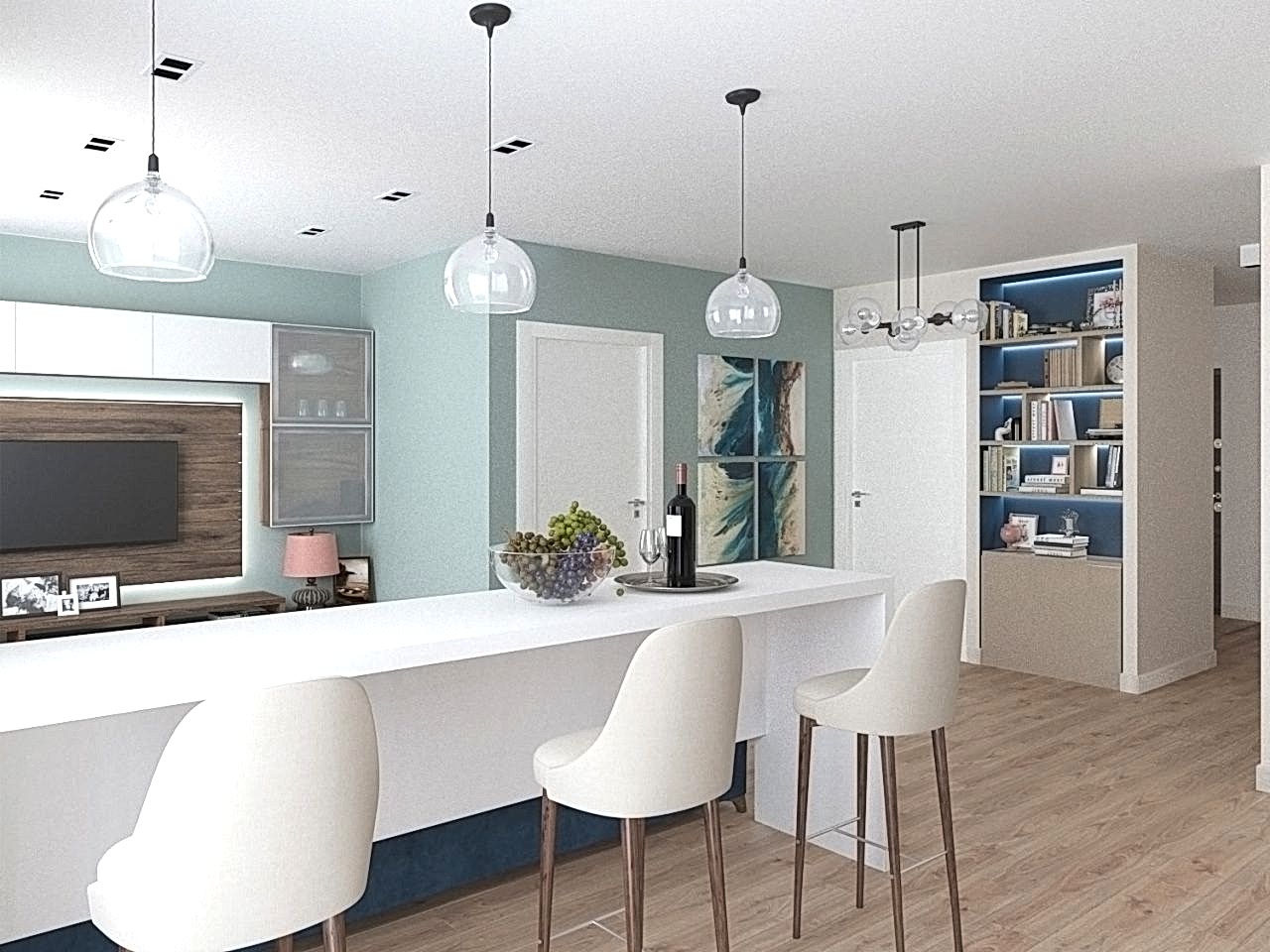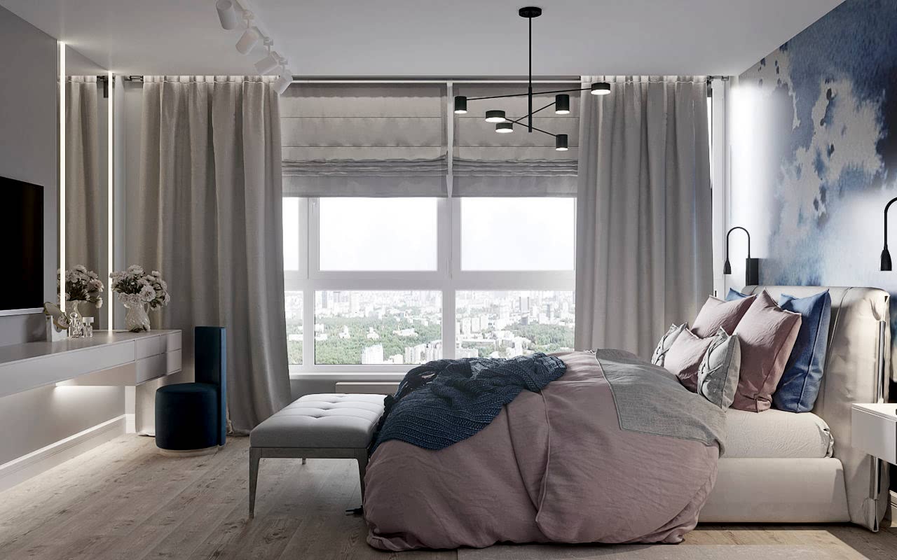 Что вы чувствуете, когда смотрите эти визуализации? Спокойствие глубокого моря, свежий ветер в оливковой роще, уют и тепло настоящего дерева. Заказчики - семья с ребёнком-подростком (11 класс). Муж часто в разъездах, жена - создаёт домашний уют. Её главным пожеланием было избежать открытых зон хранения, всё должно быть максимально спрятано от посторонних глаз. Единственное исключение - сквозной стеллаж в комнате сына. Его можно использовать для актуальных книг, фоторамок и приятных памятных мелочей. Во всём интерьере наряду с природными мотивами царит графичность и упорядоченность - стена ТВ зоны в гостиной оформлена геометричными рисунками, что повторяется в линиях осветительных приборов. Стена в спальне PinUp собой всплеск эмоций в синих тонах, которые уравновешиваются приглушёнными оттенками текстиля. Для уютного времени за чашкой кофе мы переоборудовали лоджию - утеплили помещение, а также добавили функциональную зону для хранения вещей.