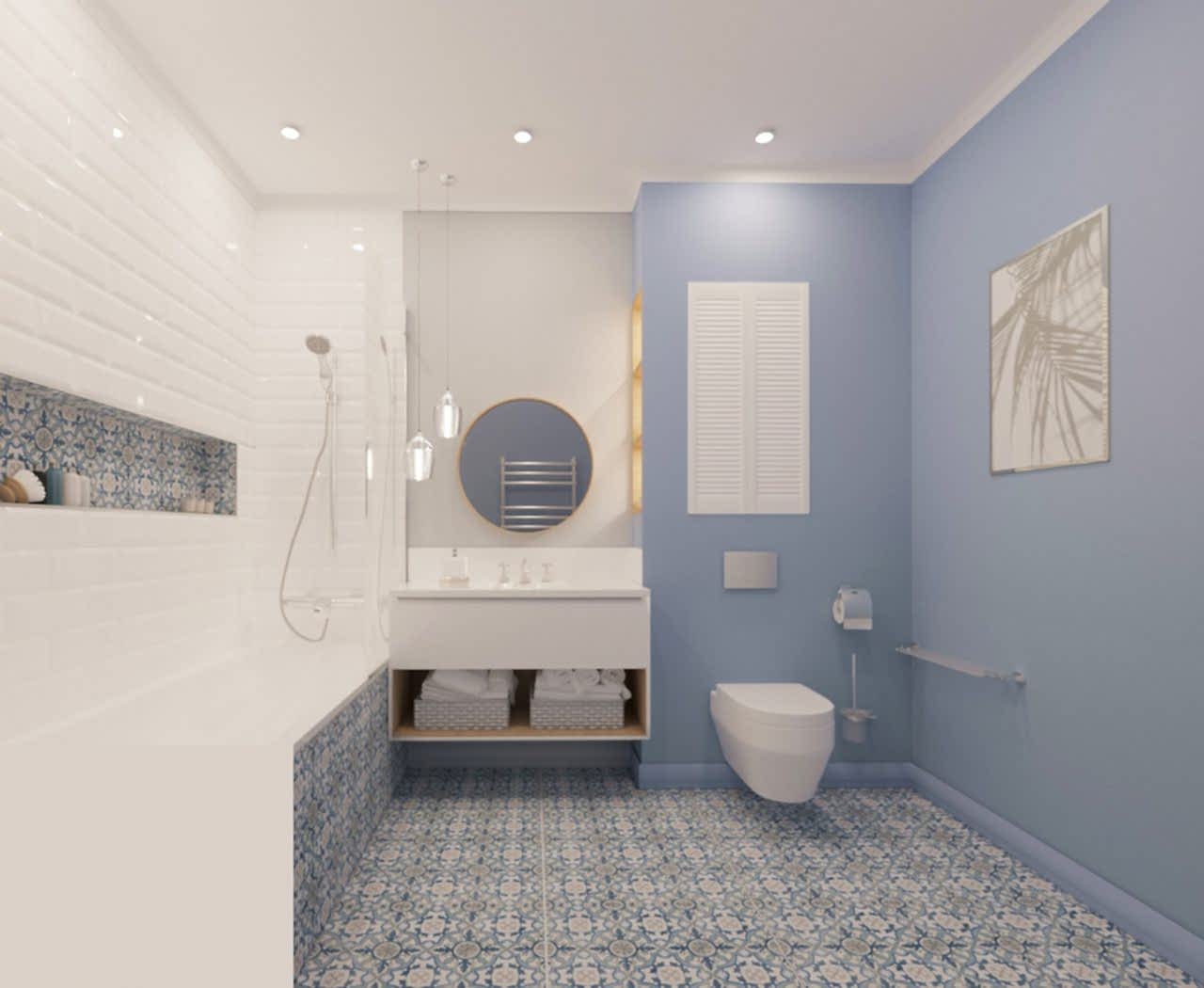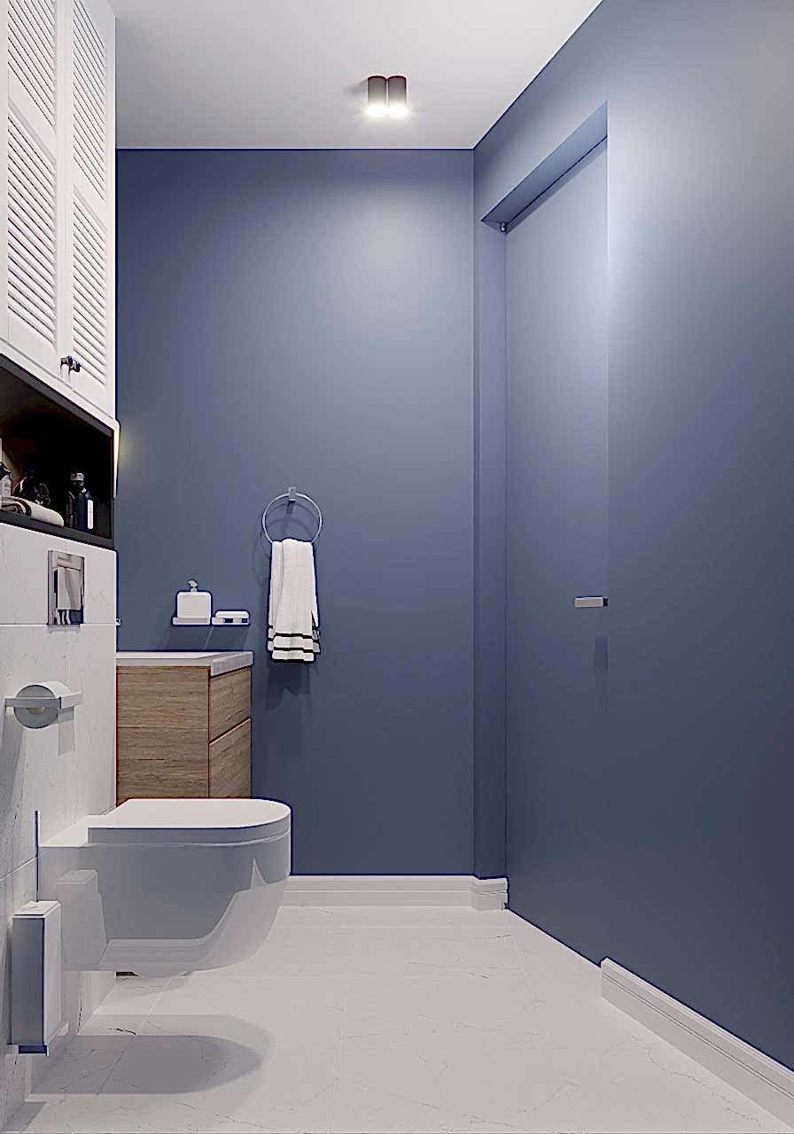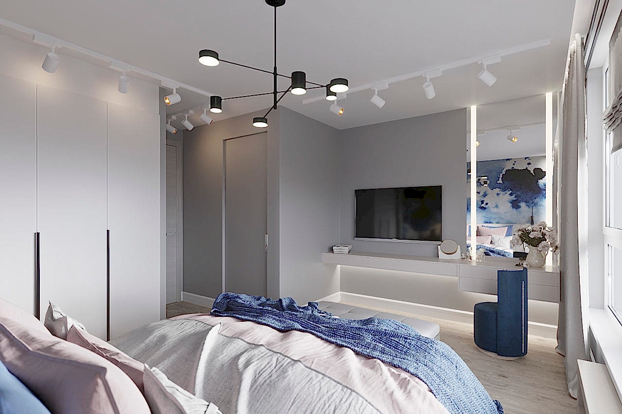 Основная проблема квартиры заключалась в очень вытянутой комнате, в которой функционально ничего нельзя было разместить. Поэтому мы объединили кухню с гостиной. Получили очень просторную кухню-гостиную. С помощью перегородки сделали гардеробную, вход в которую из спальни. По желанию заказчиков, спальня получилась небольшая, зато вместительная гардеробная. Объединили туалет и ванну. Совместили плитку с покраской для поддержания общей цветовой гаммы всей квартиры. Использовали спокойные тона морской тематики, так как заказчики родом из Владивостока и им это близко по духу. PinUp получился минималистичный, спокойный и очень уютный.