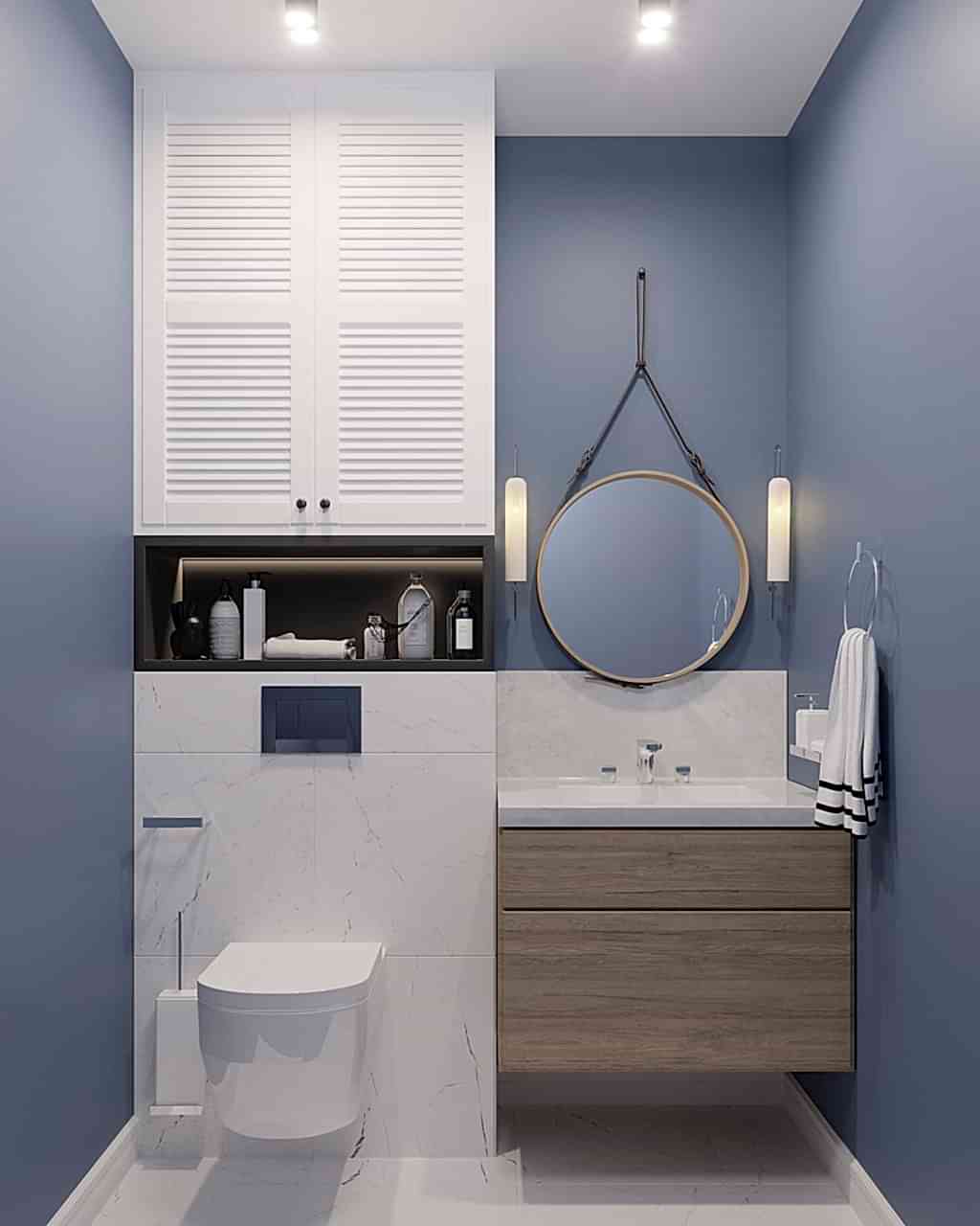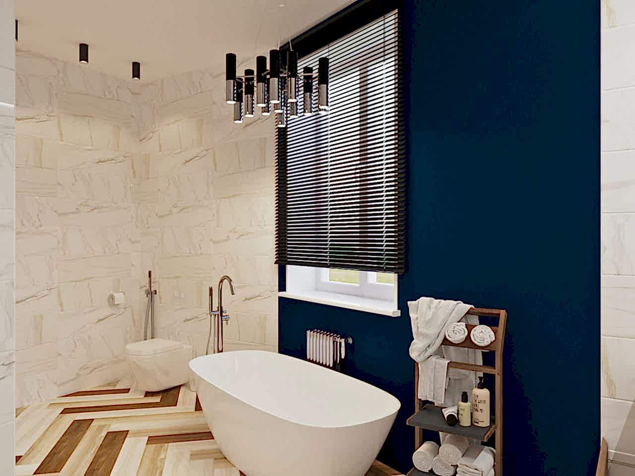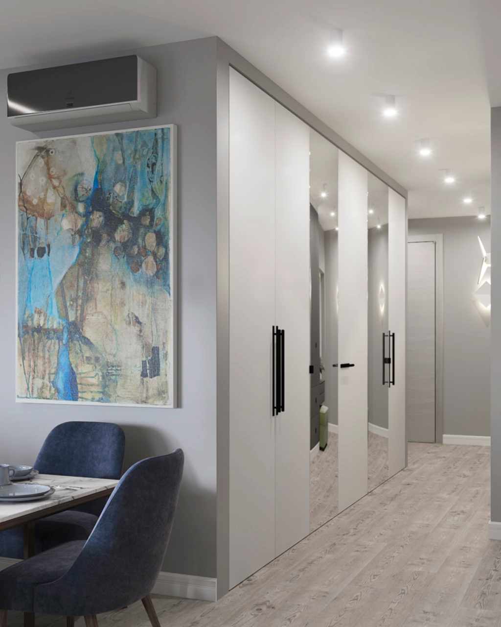 Основная проблема квартиры заключалась в очень вытянутой комнате, в которой функционально ничего нельзя было разместить. Поэтому мы объединили кухню с гостиной. Получили очень просторную кухню-гостиную. С помощью перегородки сделали гардеробную, вход в которую из спальни. По желанию заказчиков, спальня получилась небольшая, зато вместительная гардеробная. Объединили туалет и ванну. Совместили плитку с покраской для поддержания общей цветовой гаммы всей квартиры. Использовали спокойные тона морской тематики, так как заказчики родом из Владивостока и им это близко по духу. PinUp получился минималистичный, спокойный и очень уютный.