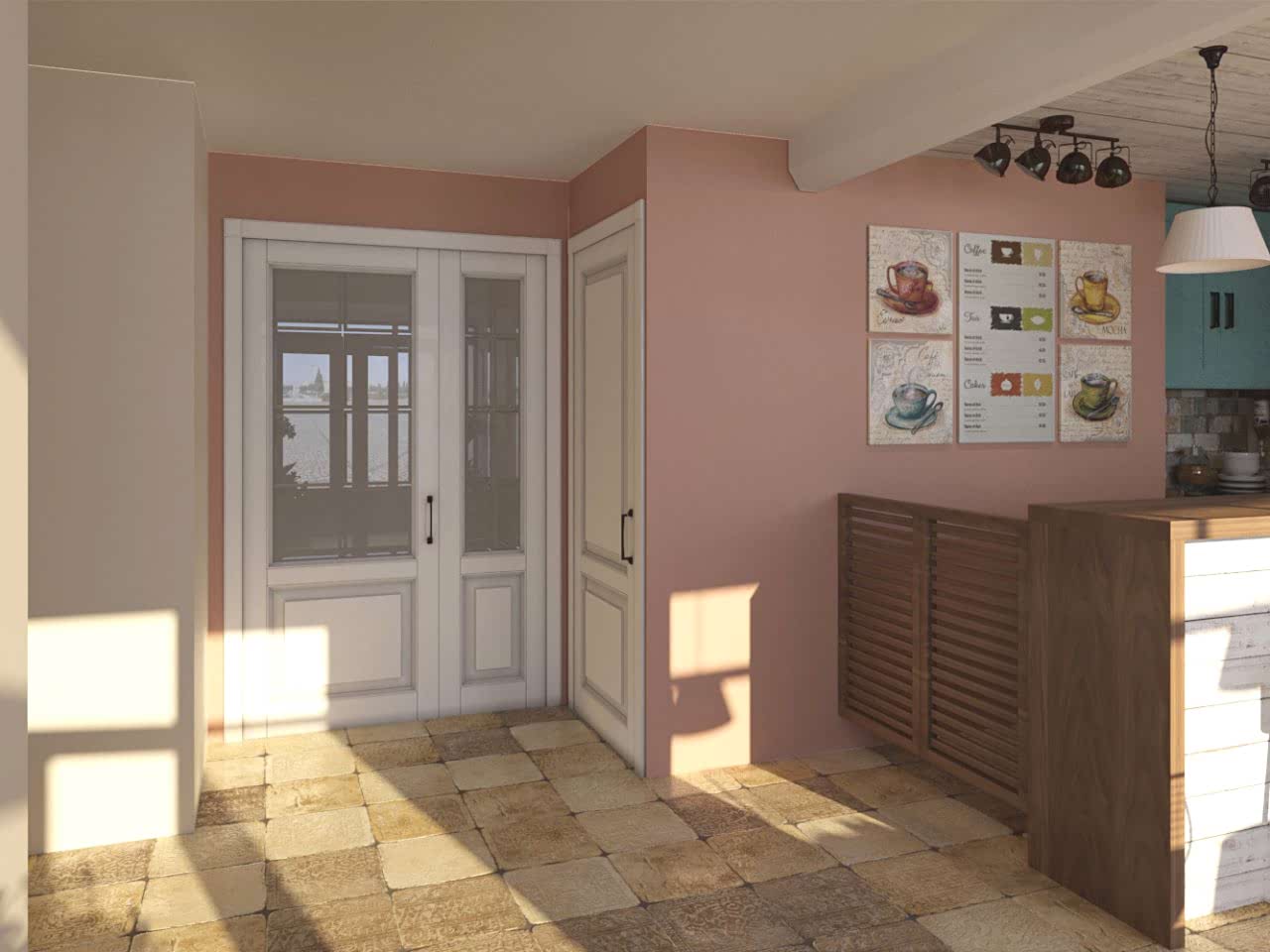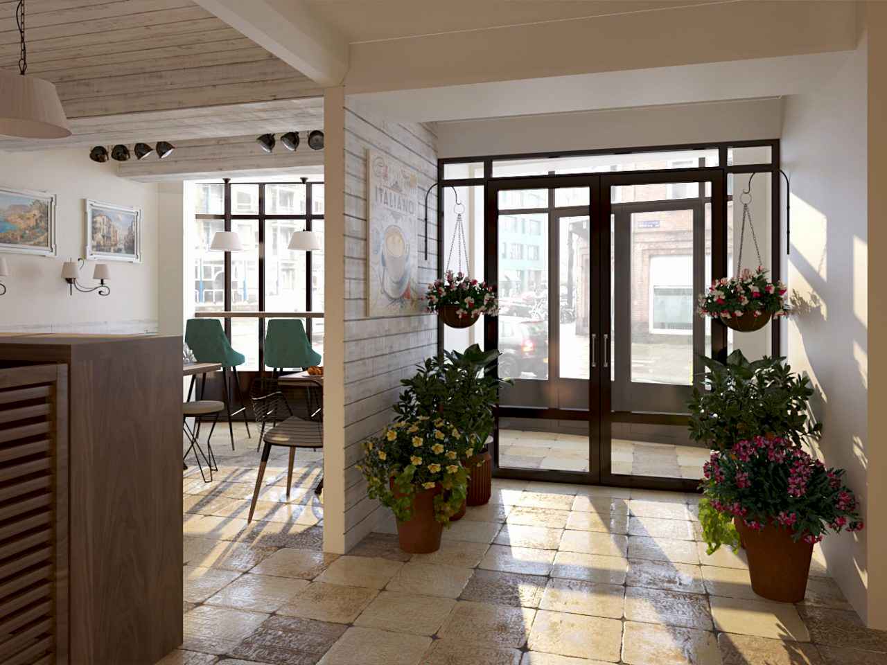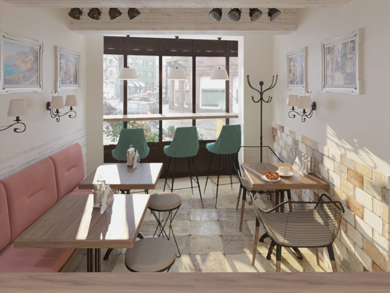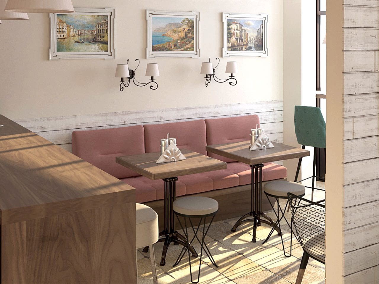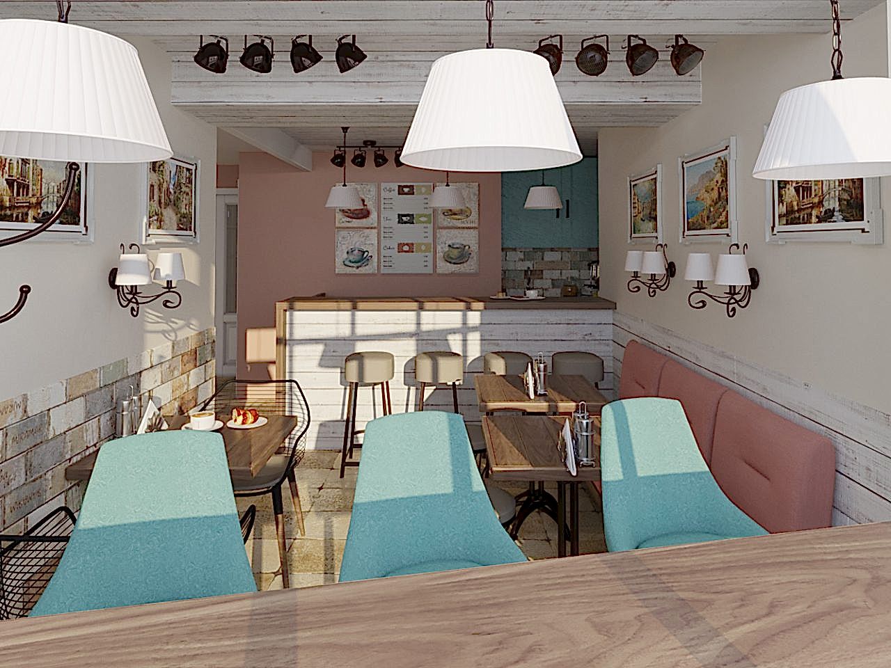 Интерьер кофейни выполнен в светлых тонах с использованием бежевого, бирюзового и кораллового оттенков. Сочетание цветов ассоциируется с живописными пейзажами Италии, что позволяет погрузиться в уютную теплую атмосферу летнего итальянского кафе.