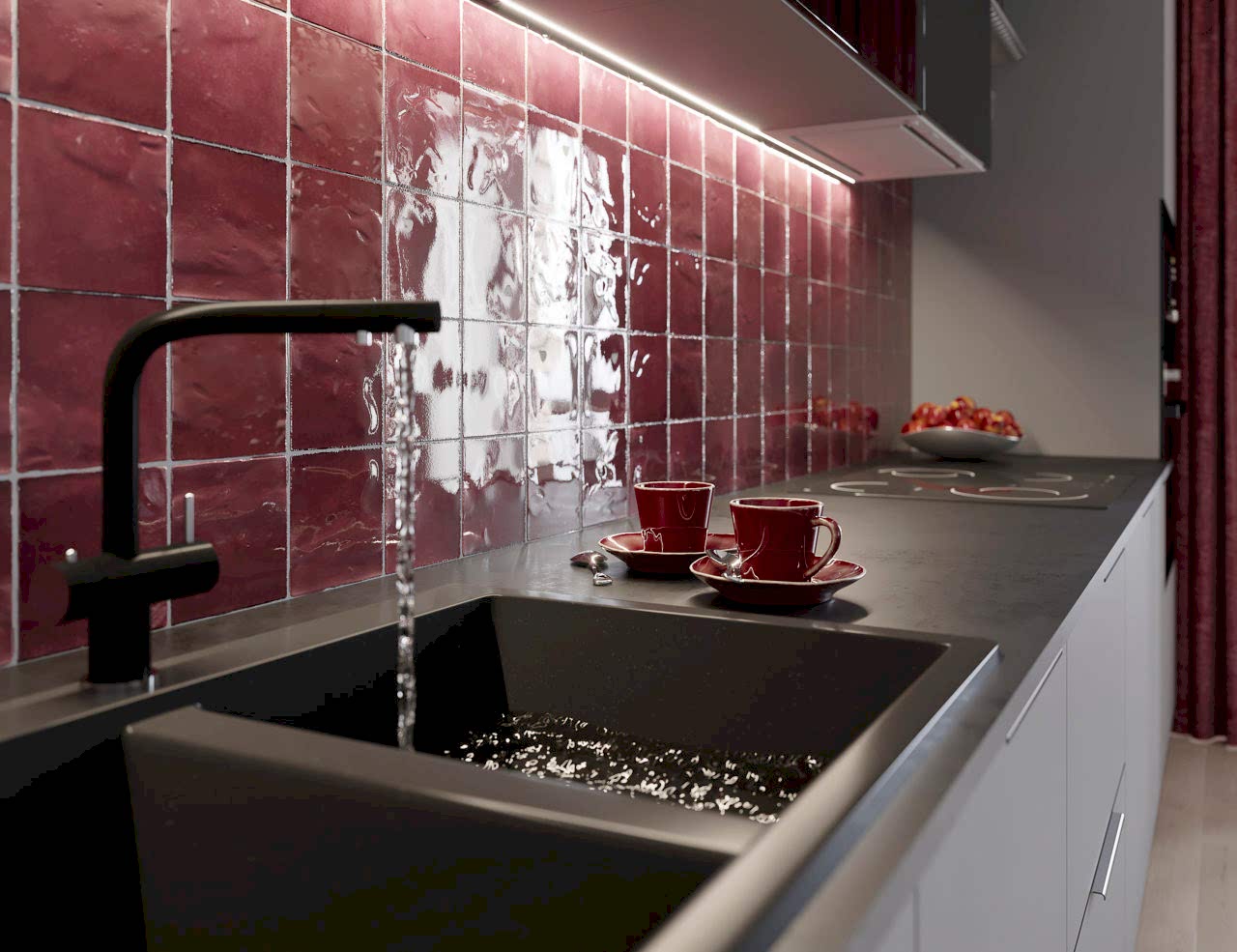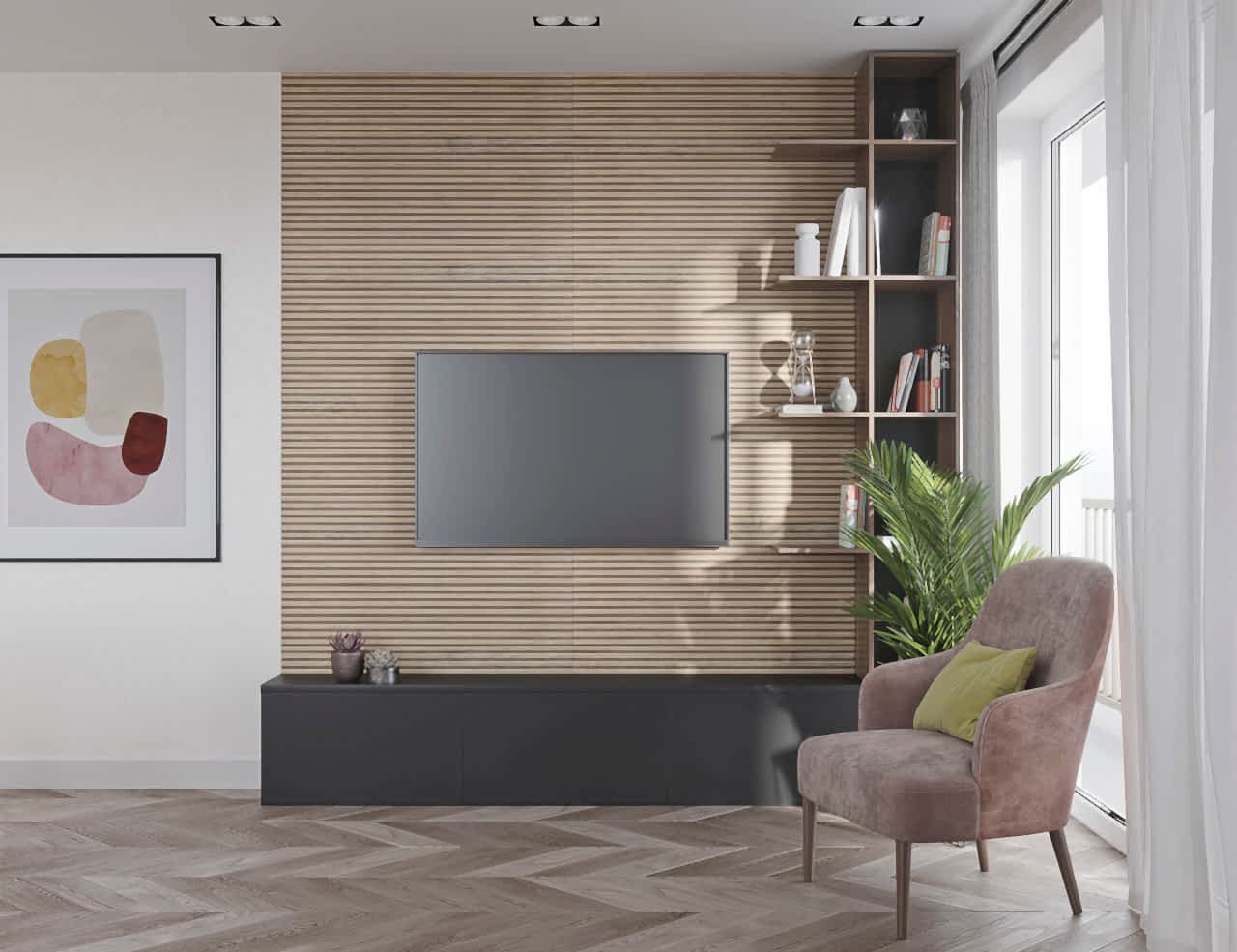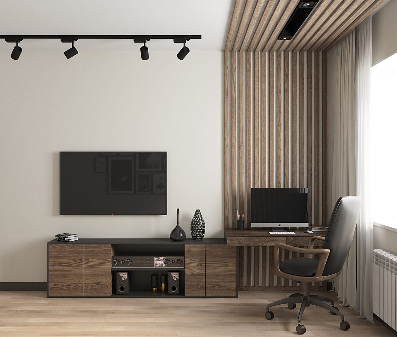 Стильная кухня-гостиная оборудована ТВ-зоной - PinUp цвета графит перекликается с кухонным гарнитуром. Пространство объединяет текстура дерева - обеденная зона, напольное покрытие, а также модное решение в виде настенных реек.
