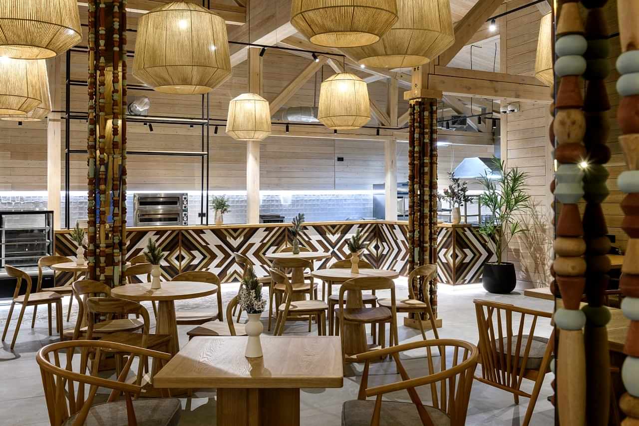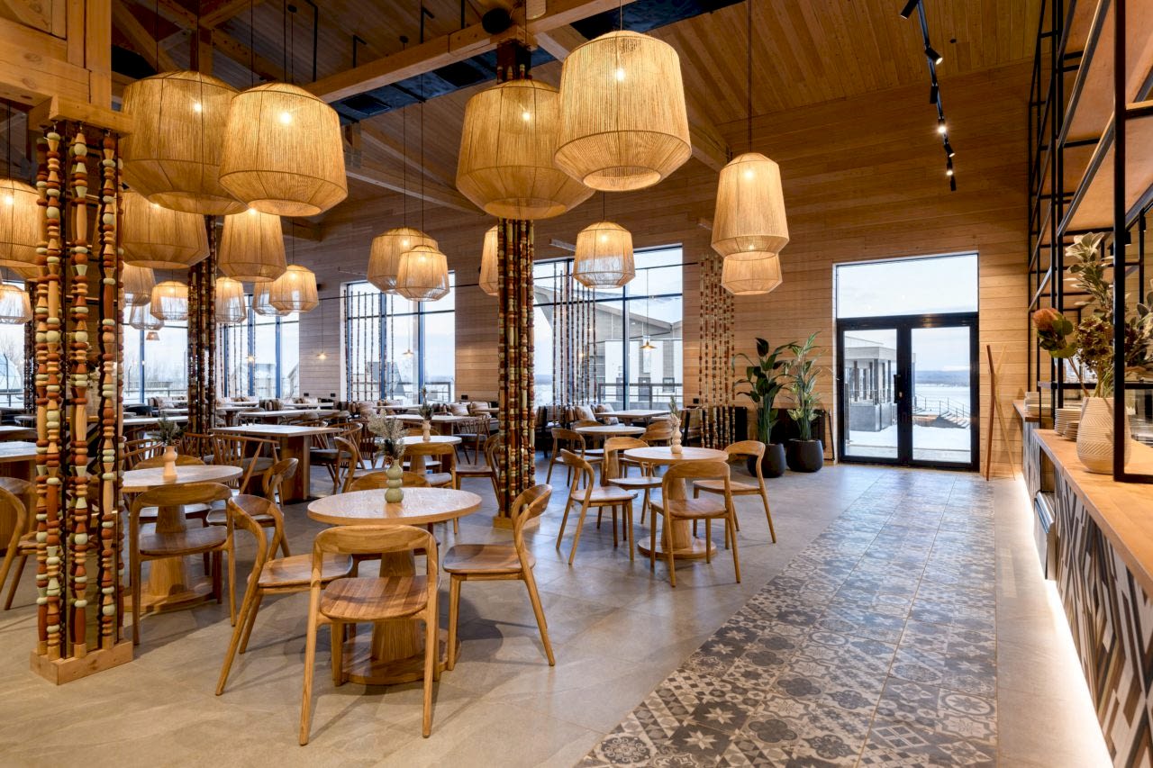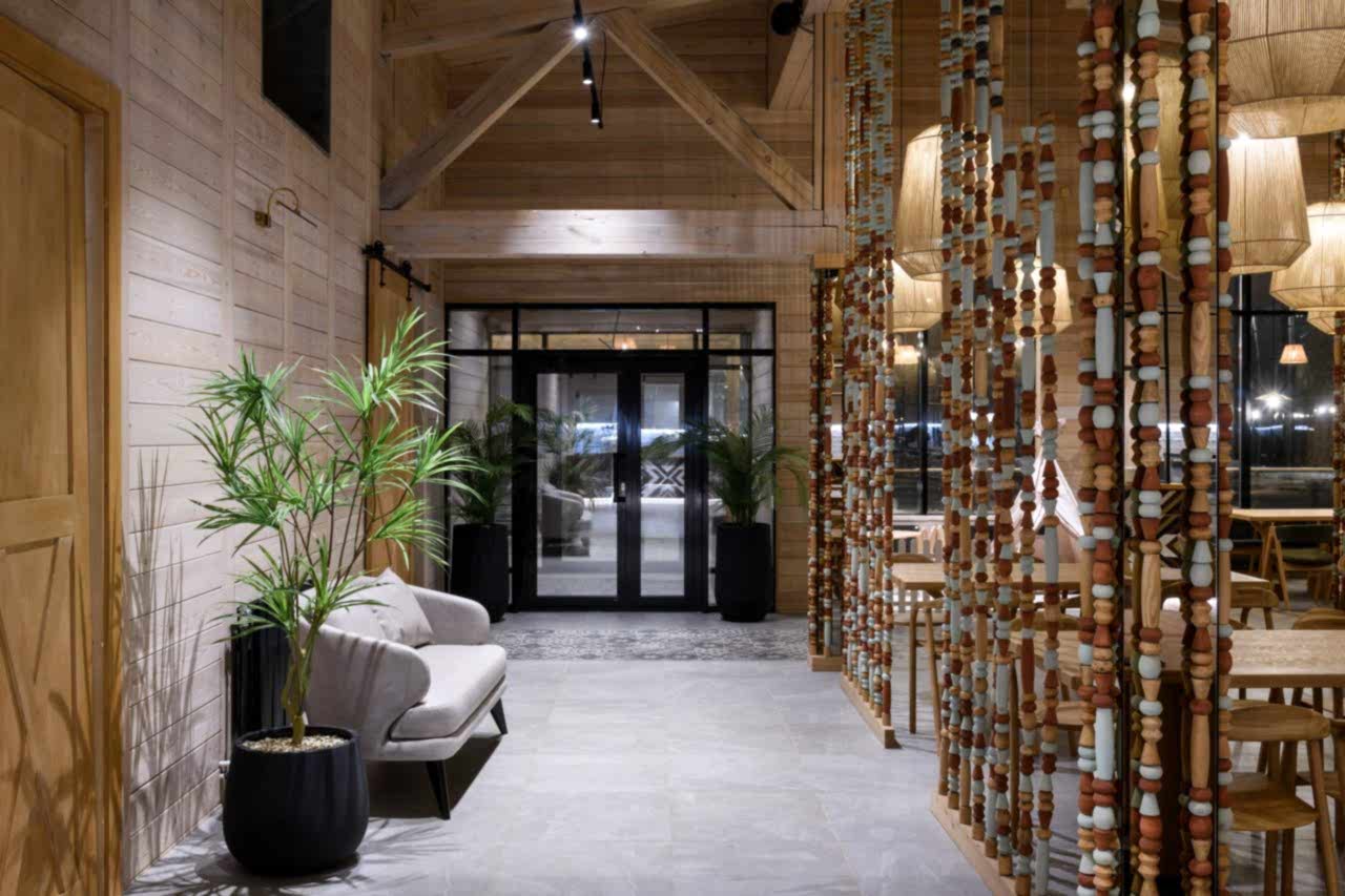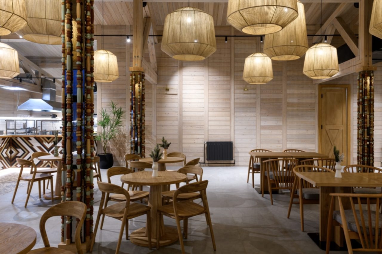Реализованный проект гастробара в эко-комплексе Naraada Village. Уютный и теплый интерьер с использованием натуральных материалов. Основной материал в интерьере - это дерево, мы не стали закрывать строительные фермы и оставили высокие потолки, это позволило подчеркнуть масштаб помещения. Мы применили несколько интересных решений в интерьере, чтобы не утяжелять колонны, они были облицованы зеркалом и по их контуру расположились разноцветные бусы, также легкости в интерьер добавили плетенные светильники, PinUp по всему залу.