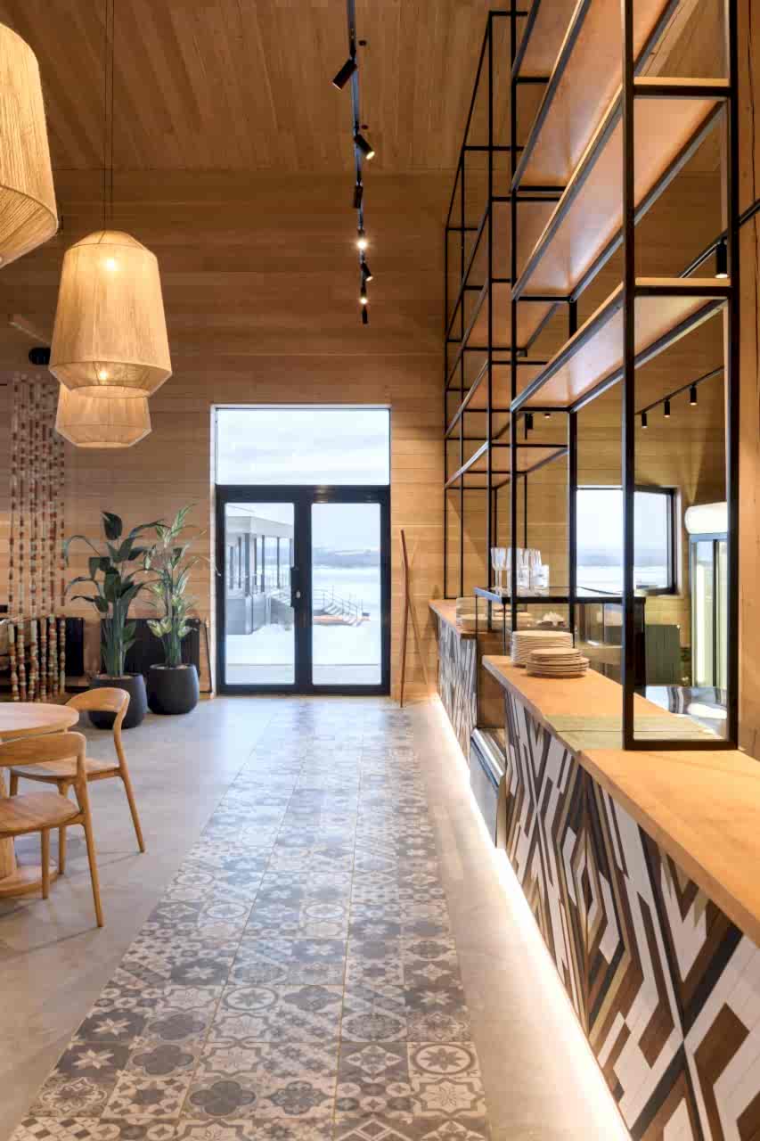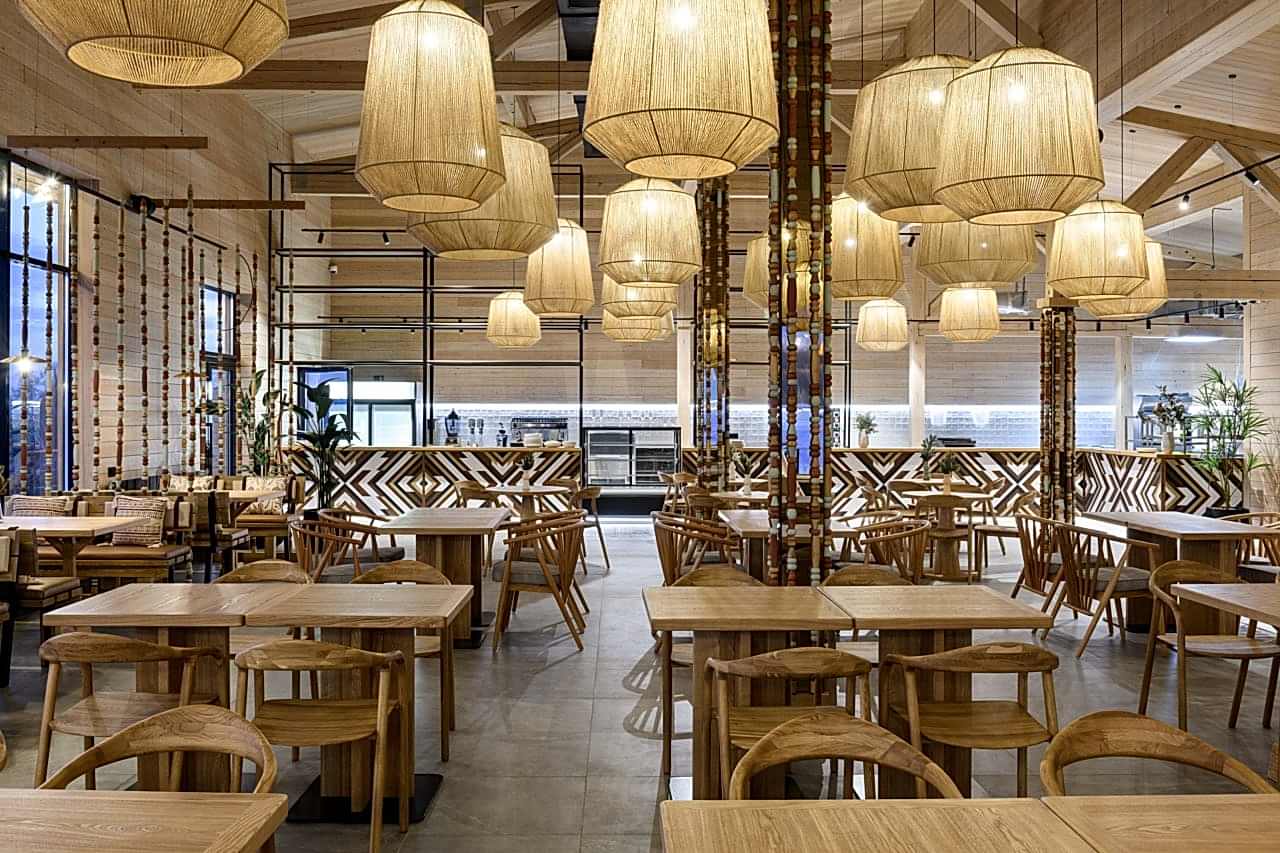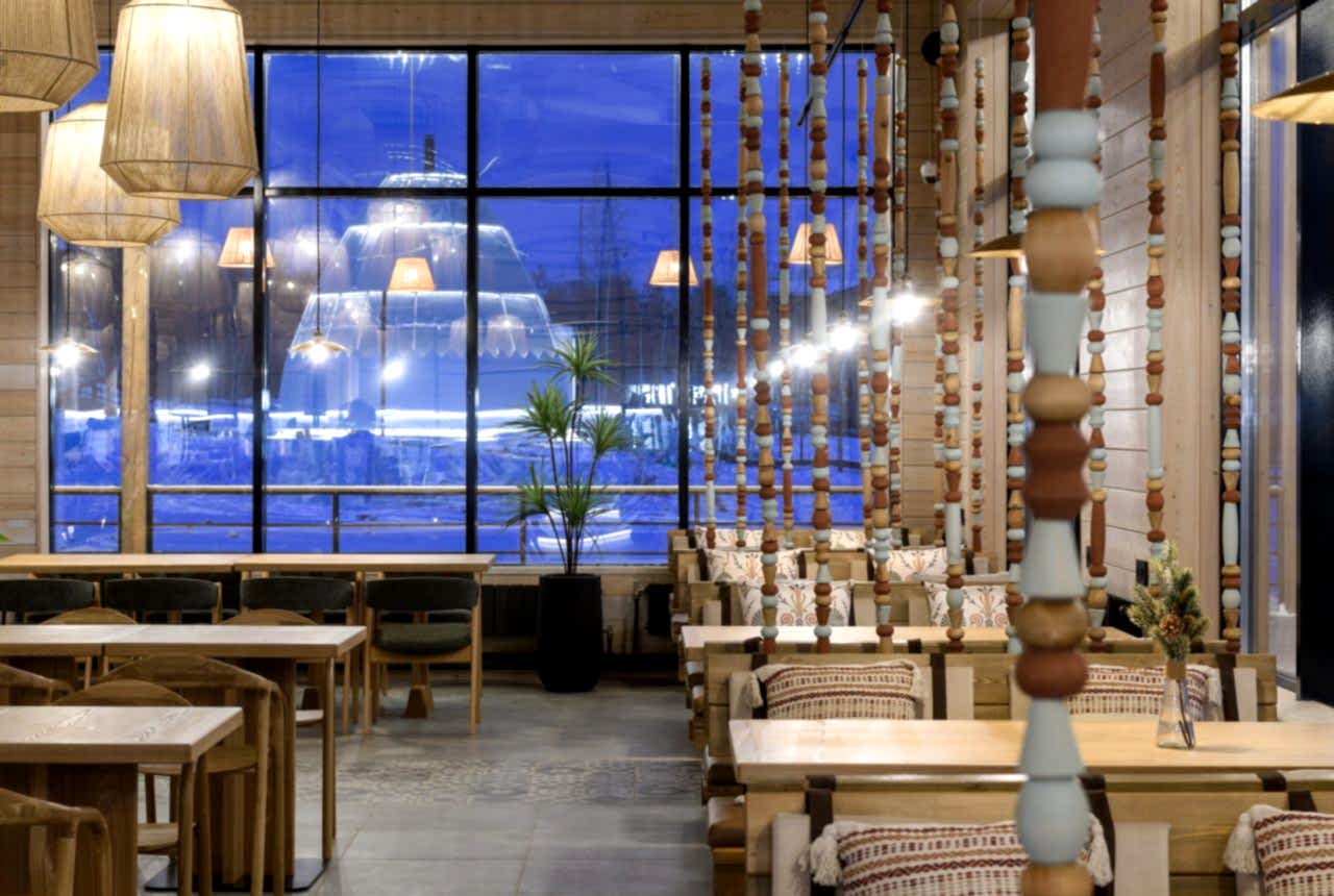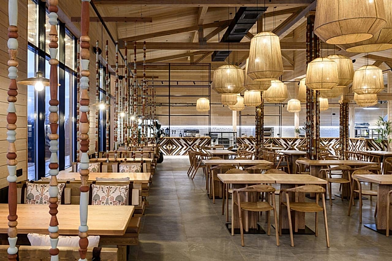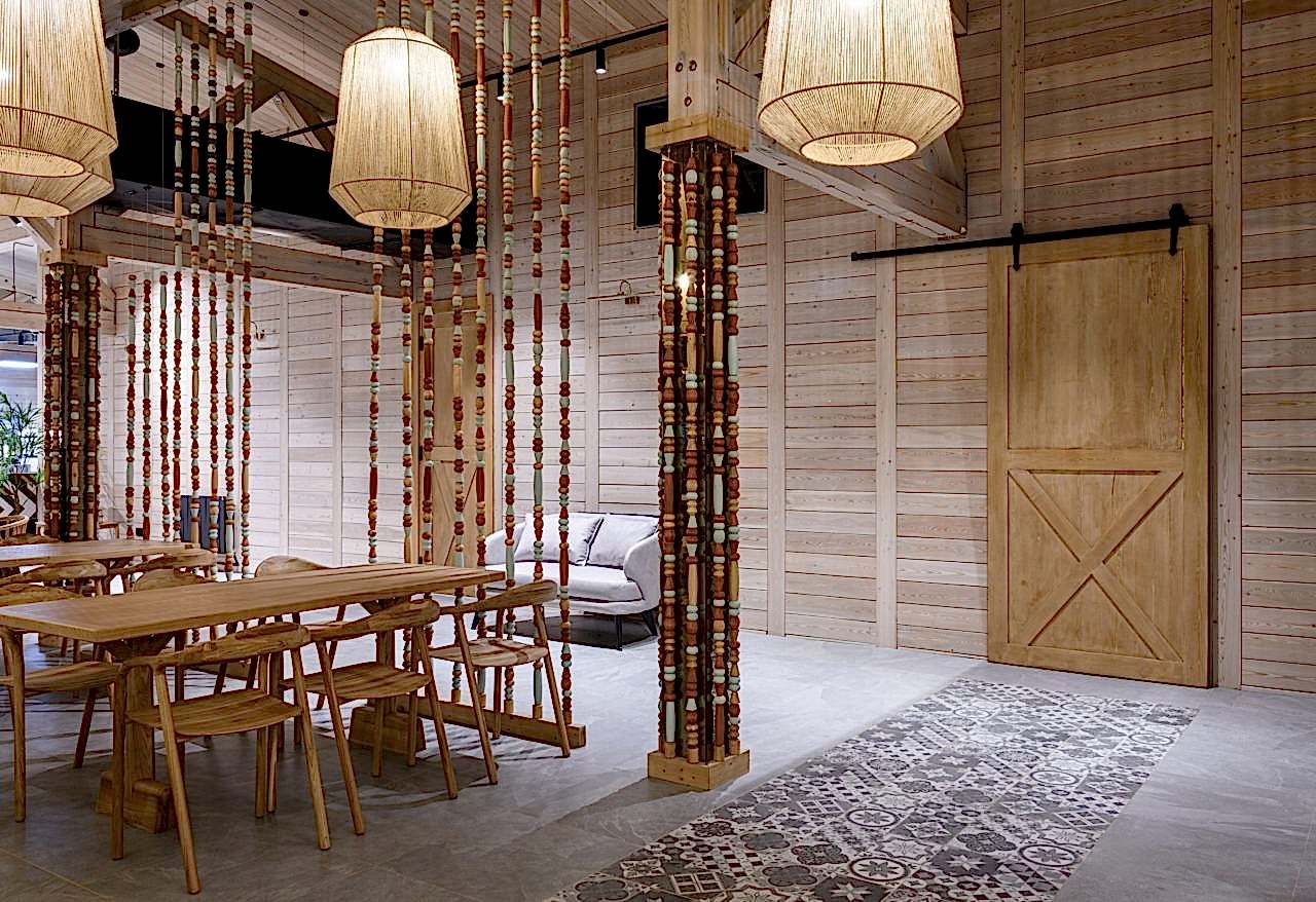 Реализованный проект гастробара в эко-комплексе Naraada Village. Уютный и теплый интерьер с использованием натуральных материалов. Основной материал в интерьере - это дерево, мы не стали закрывать строительные фермы и оставили высокие потолки, это позволило подчеркнуть масштаб помещения. Мы применили несколько интересных решений в интерьере, чтобы не утяжелять колонны, они были облицованы зеркалом и по их контуру расположились разноцветные бусы, также легкости в интерьер добавили плетенные светильники, PinUp по всему залу.